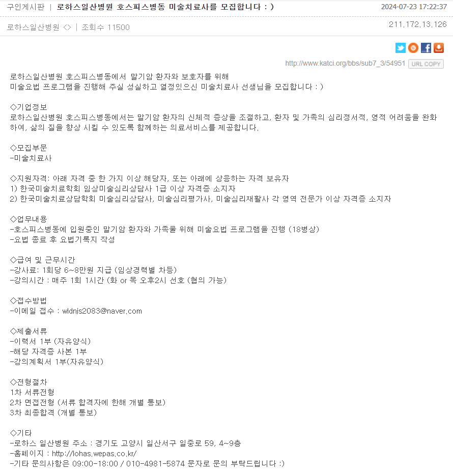 미술요법 프로그램을 진행해 주실 성실하고 열정있으신 미술치료사 선생님을 모집합니다 : )