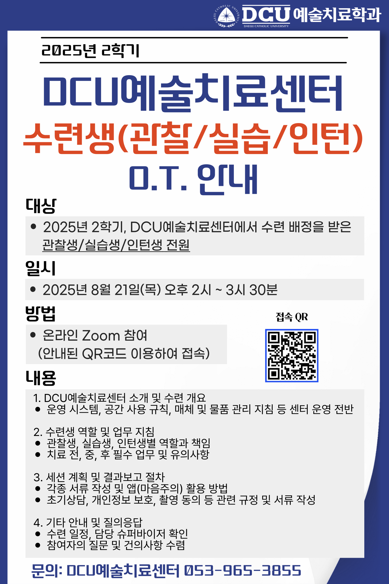 2025학년도 2학기 DCU예술치료센터에서 수련을 시작하는 관찰생, 실습생, 인턴생 여러분을 대상으로 오리엔테이션을 진행합니다.