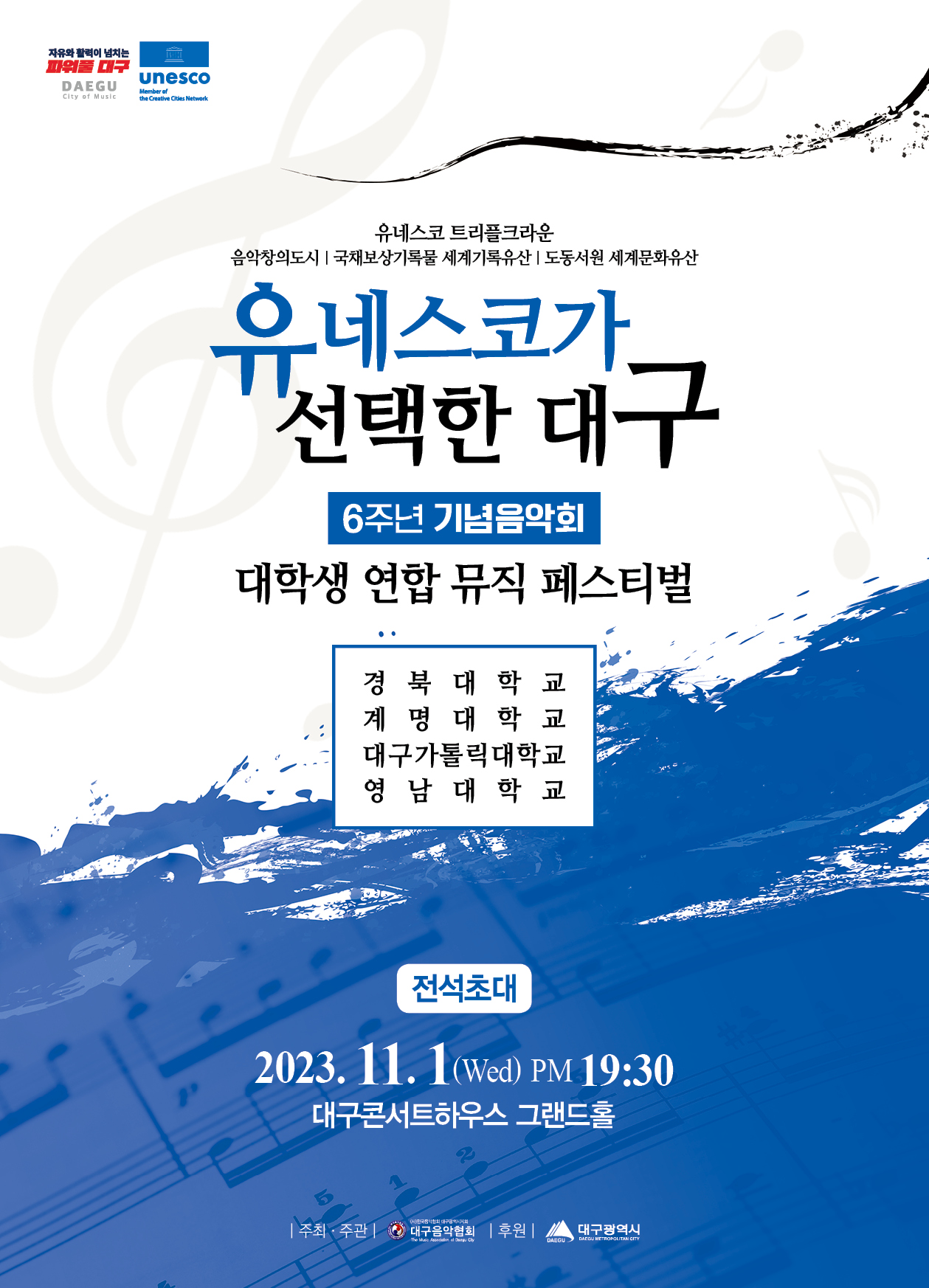 2023학년도에는 본교 주최 하에 <유네스코가 선택한 대구 6주년 기념음악회 대학생 연합 뮤직 페스티벌 > 행사를 진행하게 되었습니다. 많은 관심과 참여 부탁드립니다.