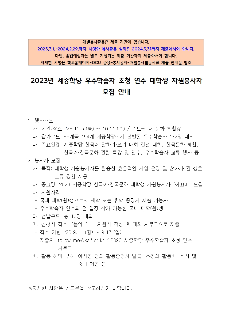 [붙임1] 2023 세종학당 우수학습자 초청 연수 대학생 자원봉사자 모집 안내문.hwp