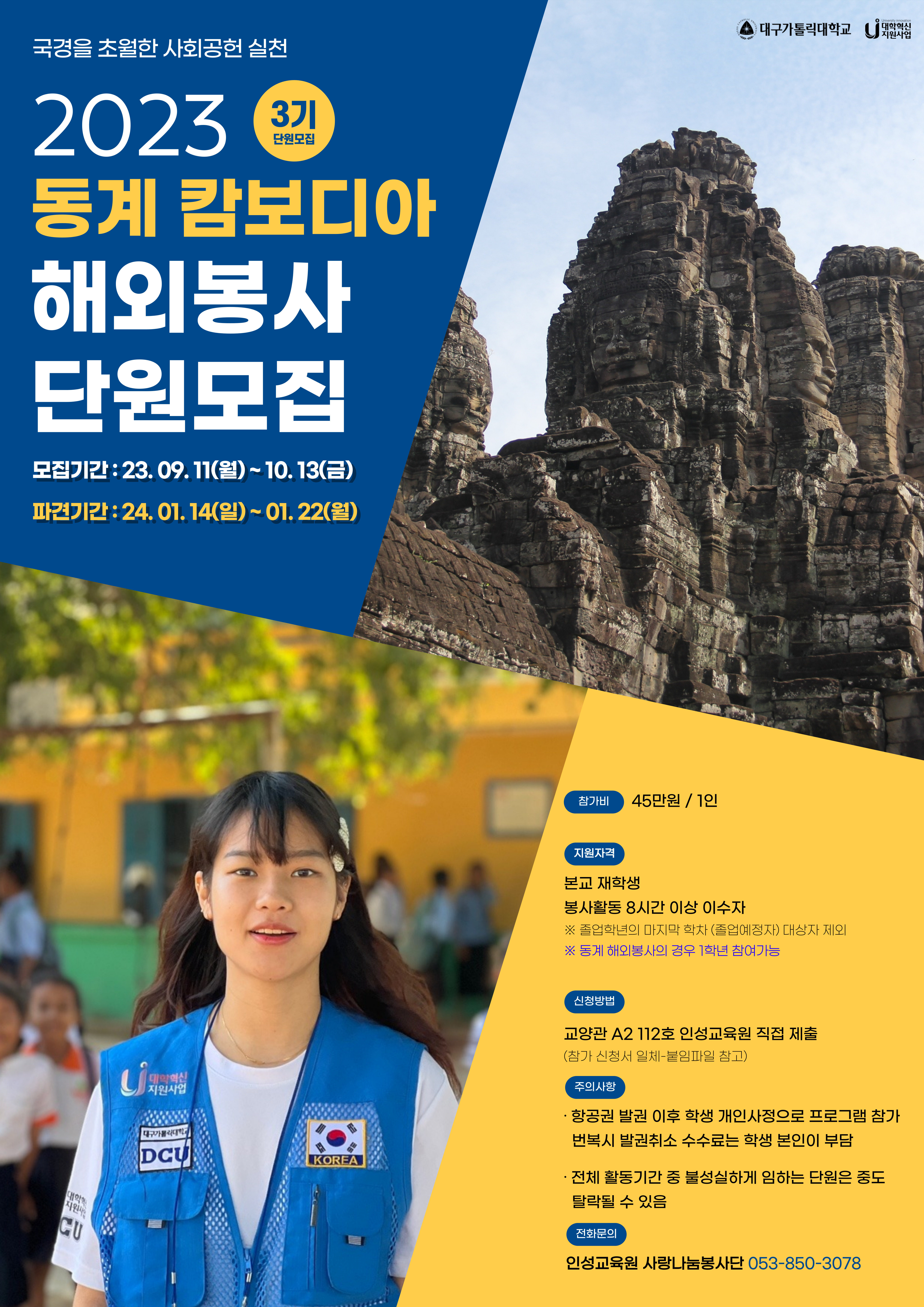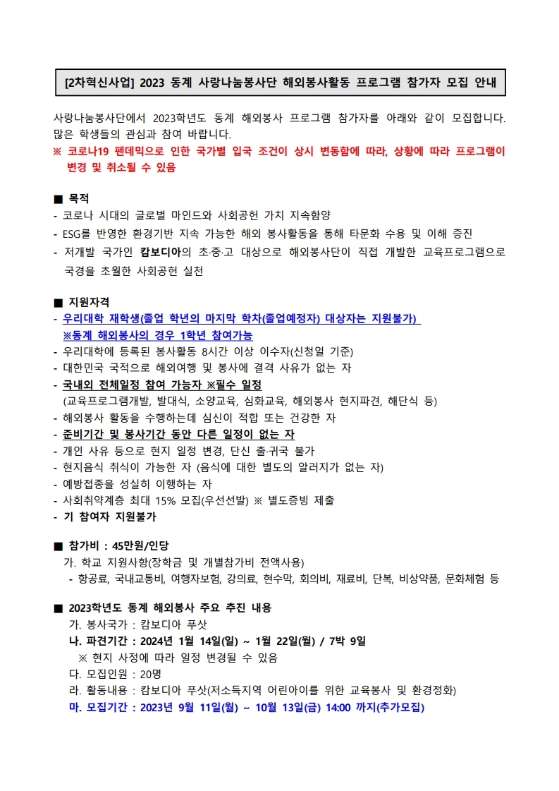 2023 동계 ESG 해외봉사 프로그램 신청안내(캄보디아) 추가모집(~10.13)