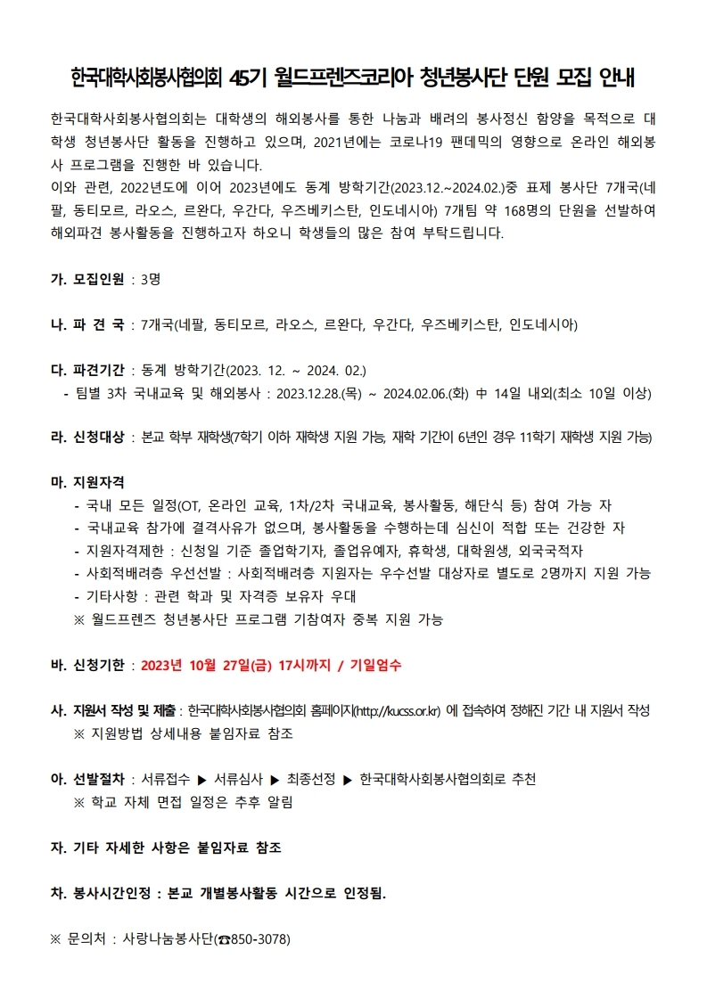 (붙임1) 45기 WFK 청년봉사단 단원 모집 안내서(학생용).hwp