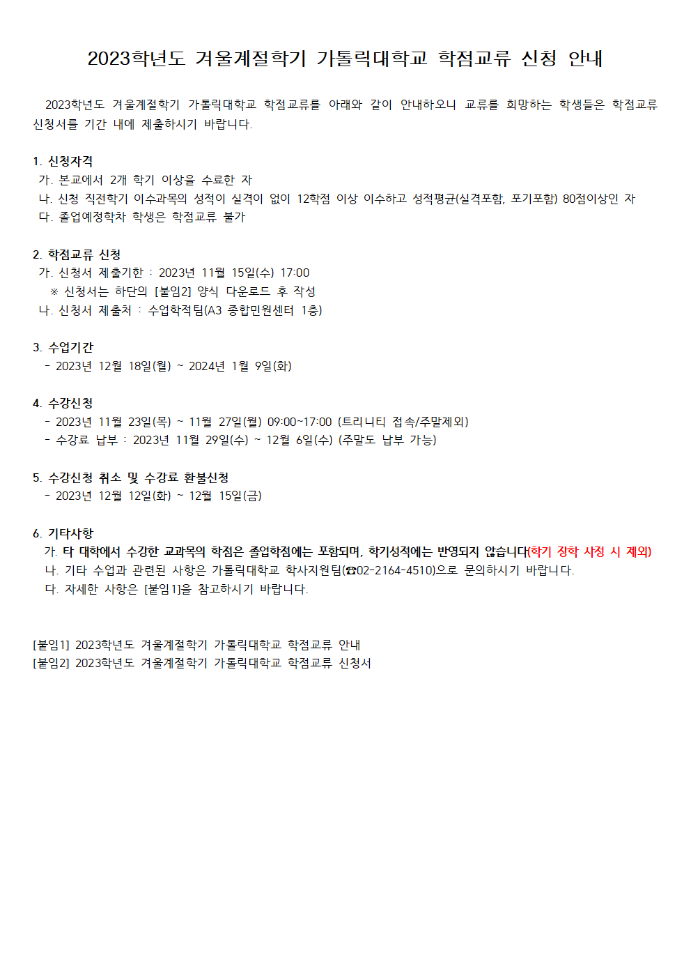 2023학년도 겨울계절학기 가톨릭대학교 학점교류 신청 안내001.png