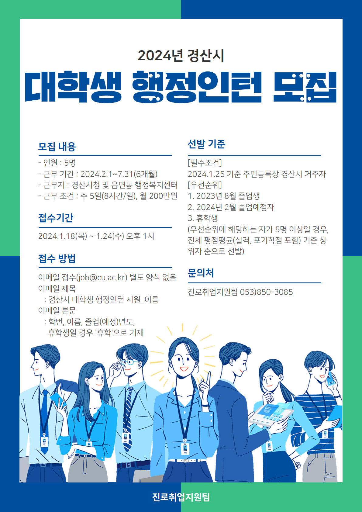 아래와 같이 2024년 경산시 대학생 행정인턴을 모집하오니 관심있는 학생들은 신청하시기 바랍니다.