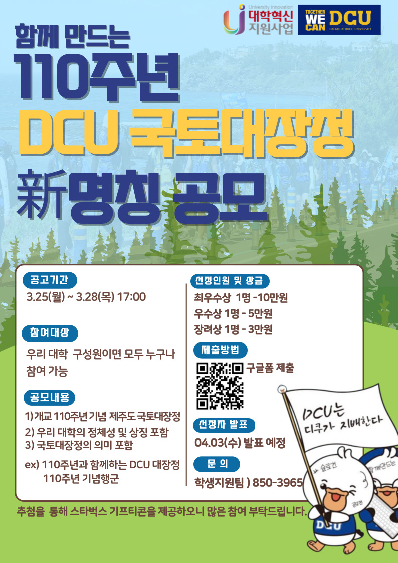 110주년 기념하여 DCU국토대장정을 대신할 新명칭을 공모합니다. 많은학생들의 참여 부탁드립니다.