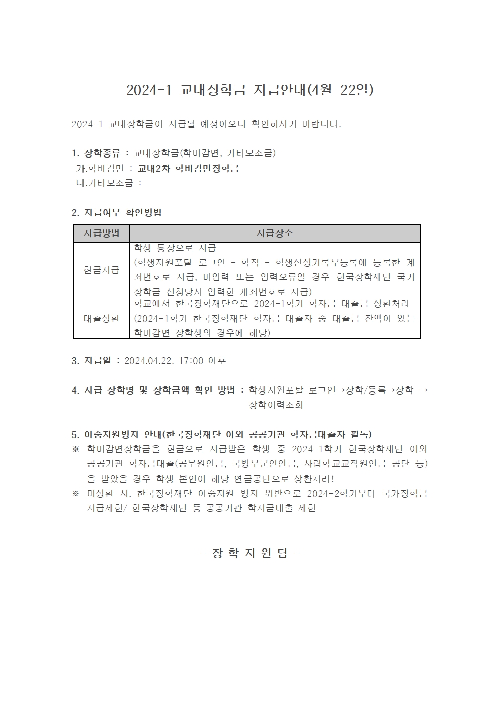 2024-1 교내장학금 지급안내(4월 22일)
