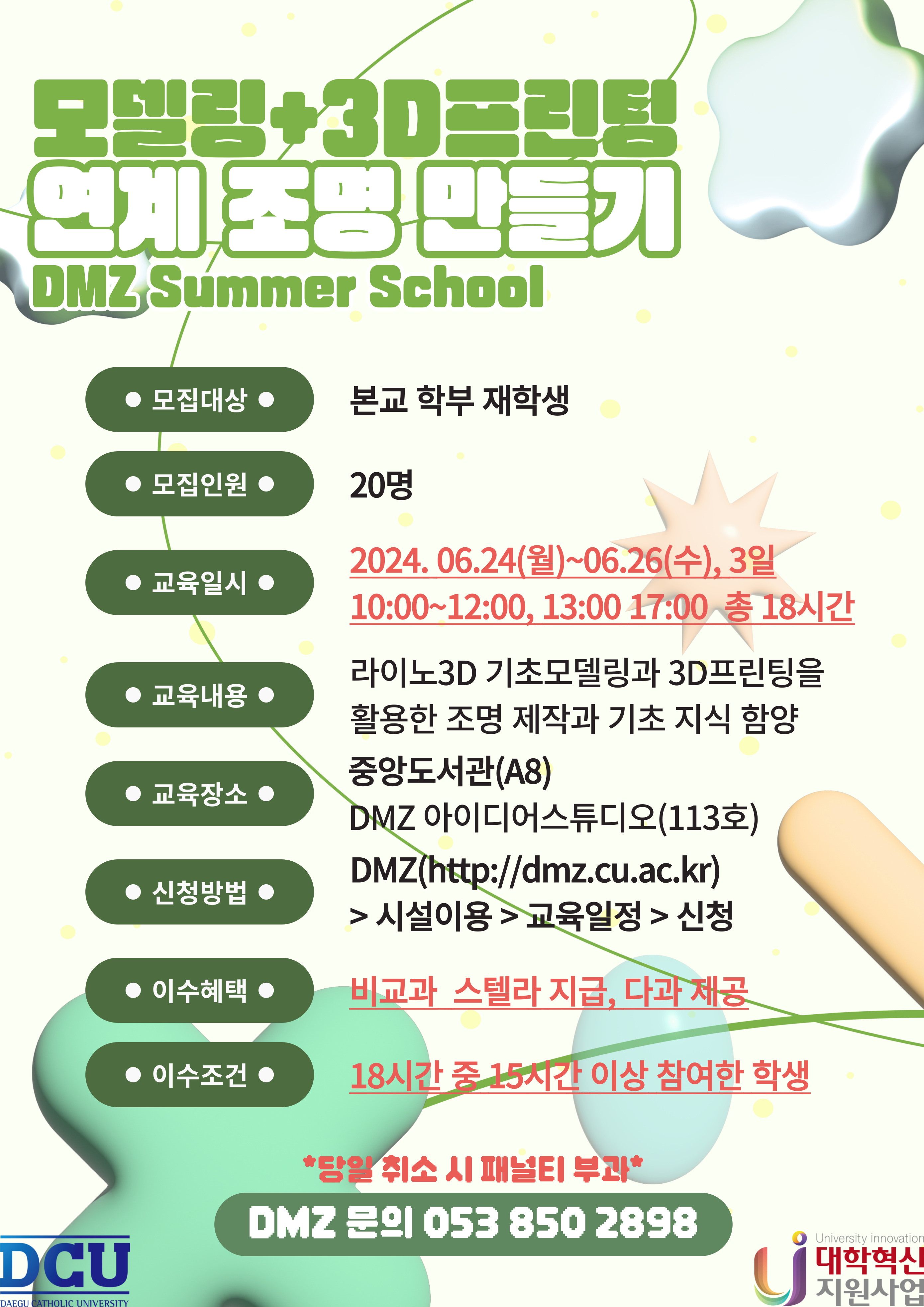 ※ 메이커스페이스 교육 신청 바로가기- 모델링+3D 프린팅 연계 조명 만들기 교육 프로그램 신청 바로가기: https://dmz.cu.ac.kr/program/edu/plan/view?id=668