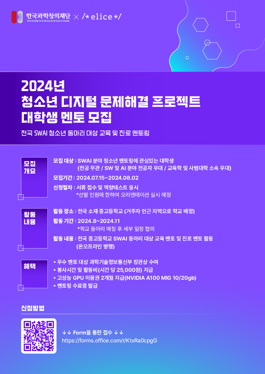 (1) 모집 대상 : SW/AI 분야 청소년 멘토링에 관심있는 대학생 (SW/AI 분야 전공자, 교육학 및 사범대학 소속 우대)