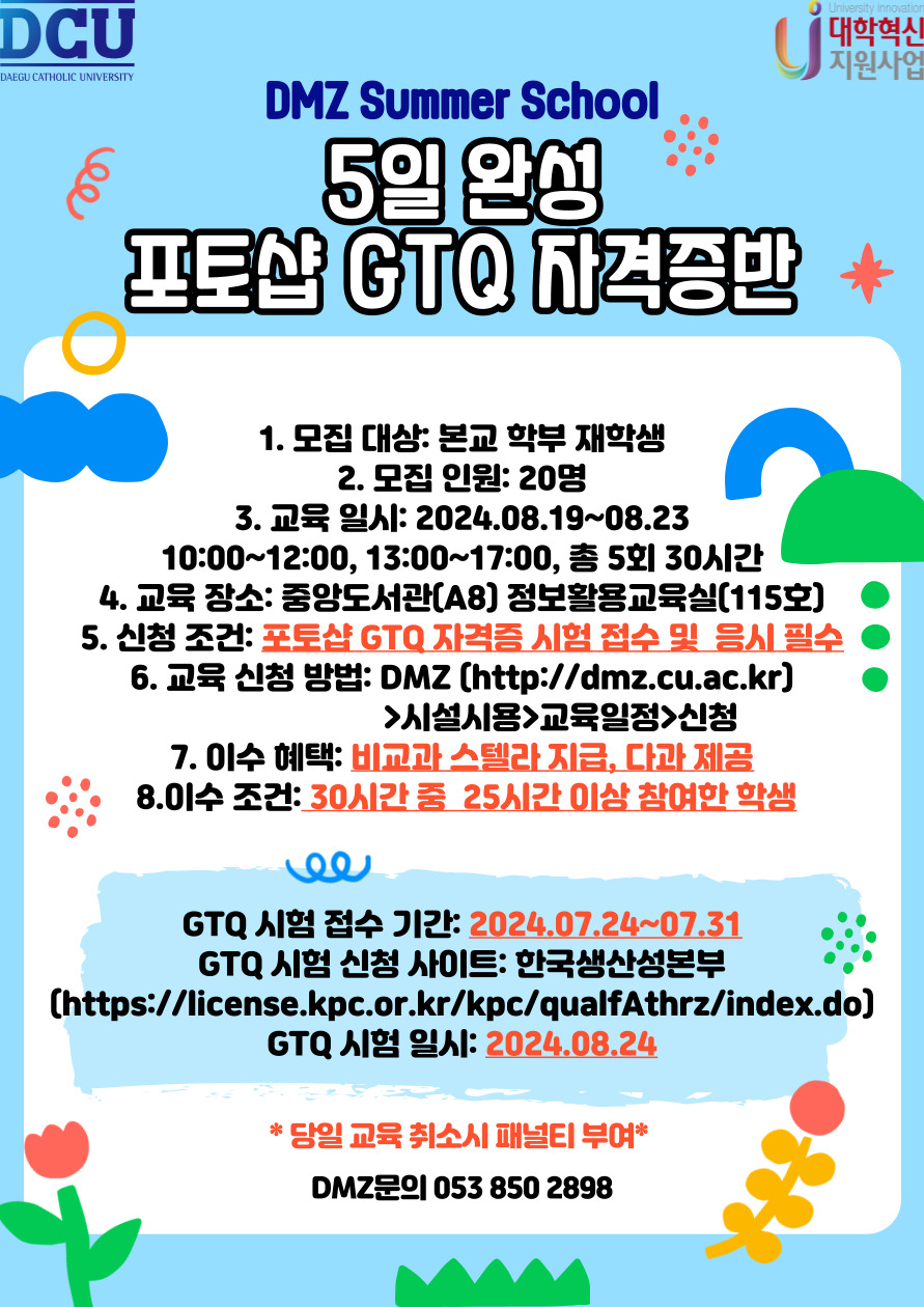 - 포토샵, 일러스트 하루에 끝내기 교육 프로그램 신청 바로가기: https://dmz.cu.ac.kr/program/edu/plan/view?id=669