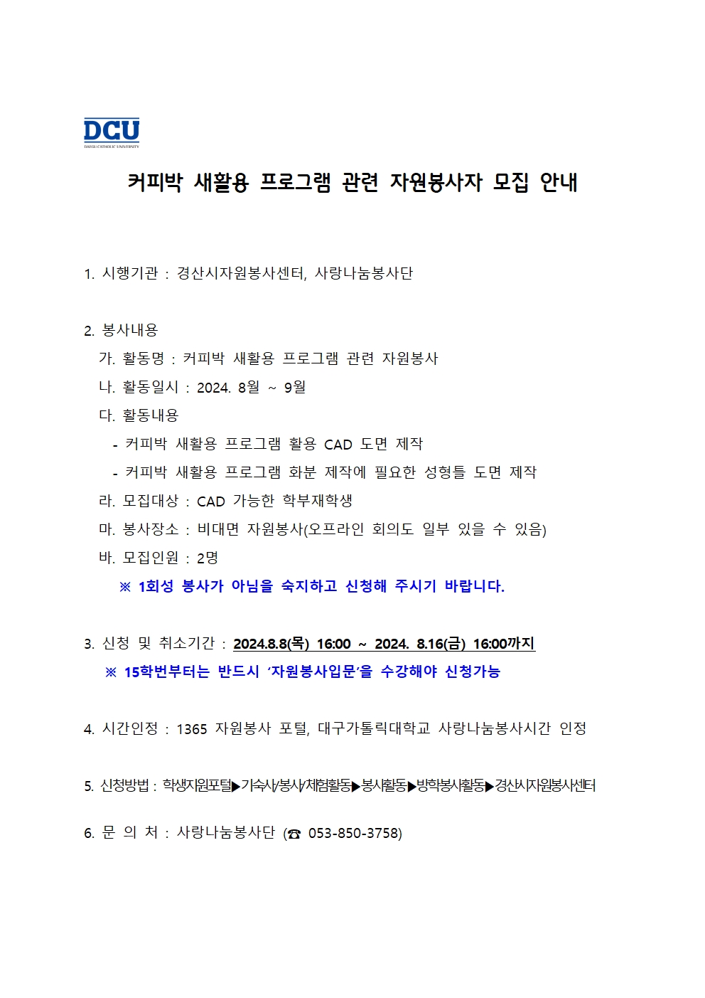 [사랑나눔봉사단주관봉사]커피박 새활용 프로그램 관련 자원봉사자 모집 안내