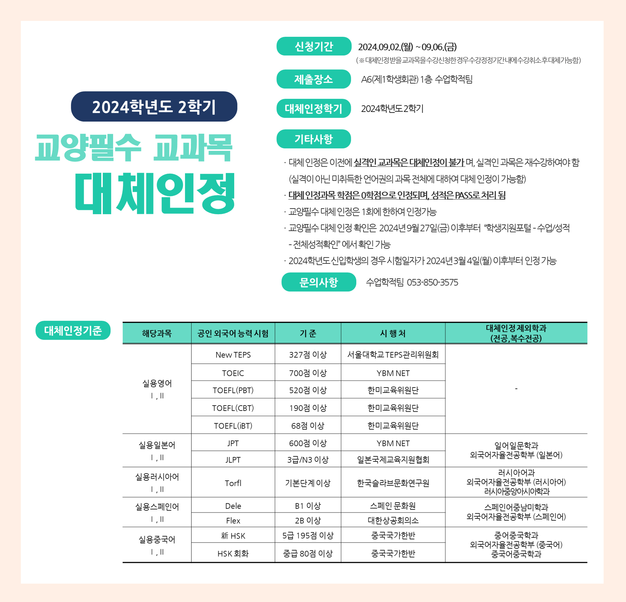 2024학년도 2학기 교양필수 교과목 대체인정 신청 안내
