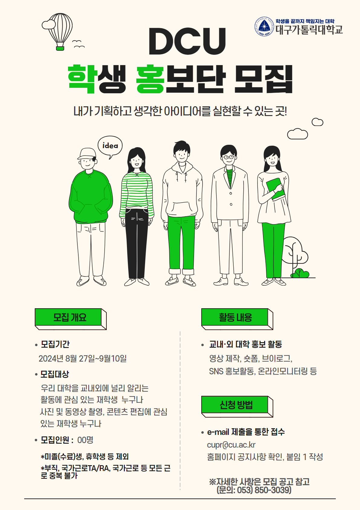 2024학년도 학생 홍보단을 다음과 같이 추가 모집하오니 관심 있는 학생들의 많은 신청을 바랍니다.