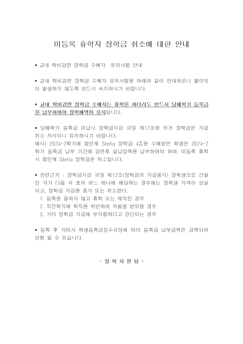 미등록 휴학자 장학금 취소에 대한 안내