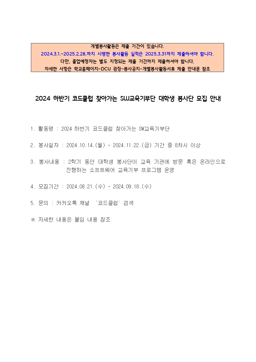 [2024 하반기 코드클럽 찾아가는 SW교육기부단] 대학생 봉사단 모집 공고 홍보 협조 요청.pdf