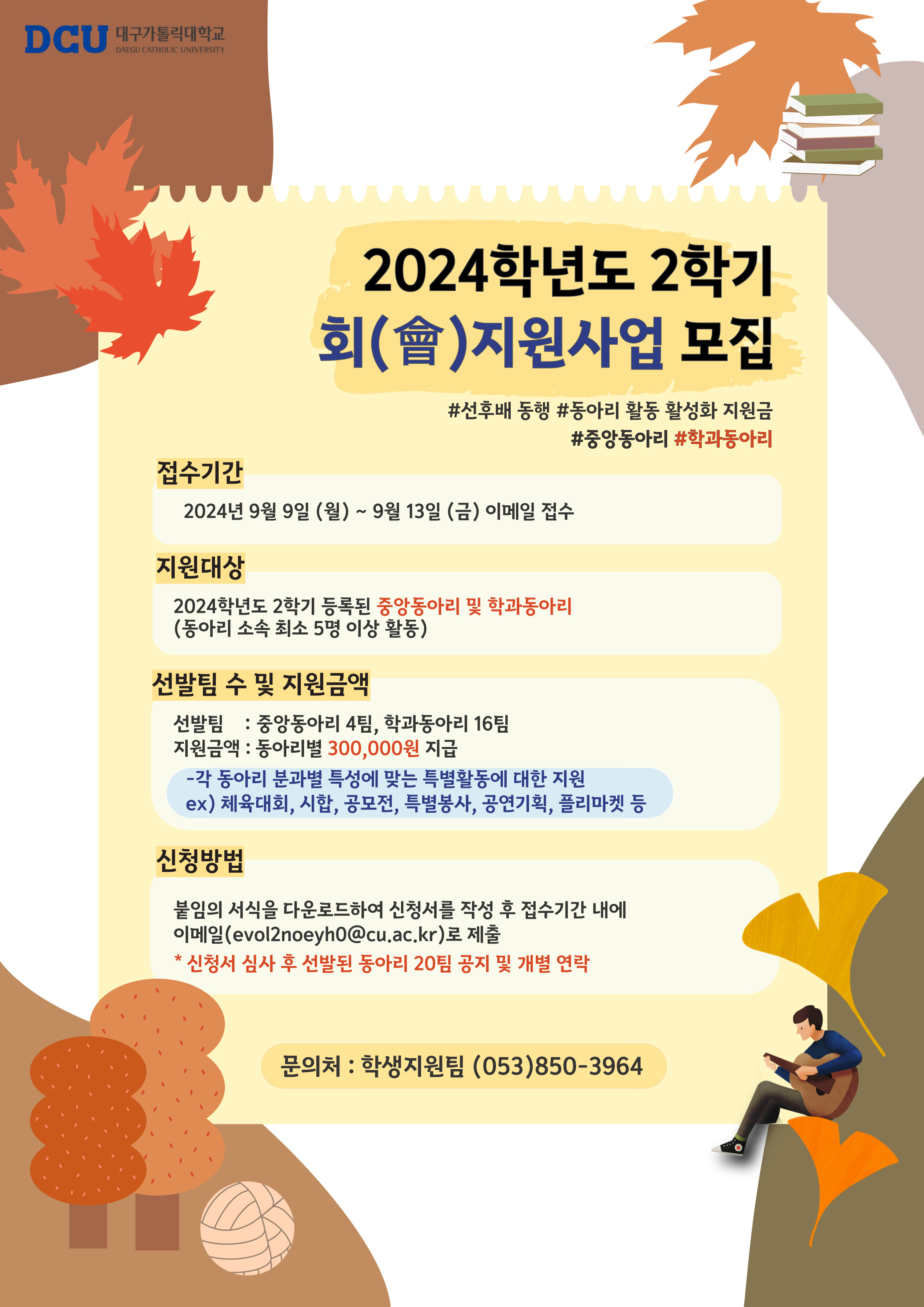 2024.09.09.(월) ~ 2024.09.13.(금) | 會지원사업 모집 | 이메일(evol2noeyh0@cu.ac.kr)로 신청서 접수 |