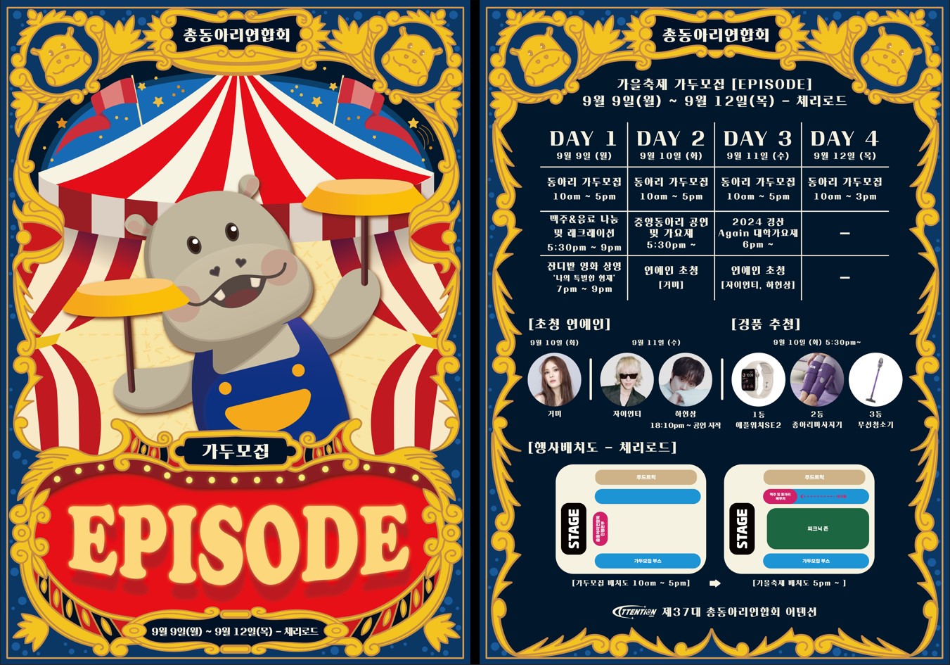 맥주&음료 나눔 및 레크레이션 17:30~21:00 | 중앙동아리 공연 및 가요제 17:30~ | 2024 경산 Again 대학 가요제 18:00~ | - |