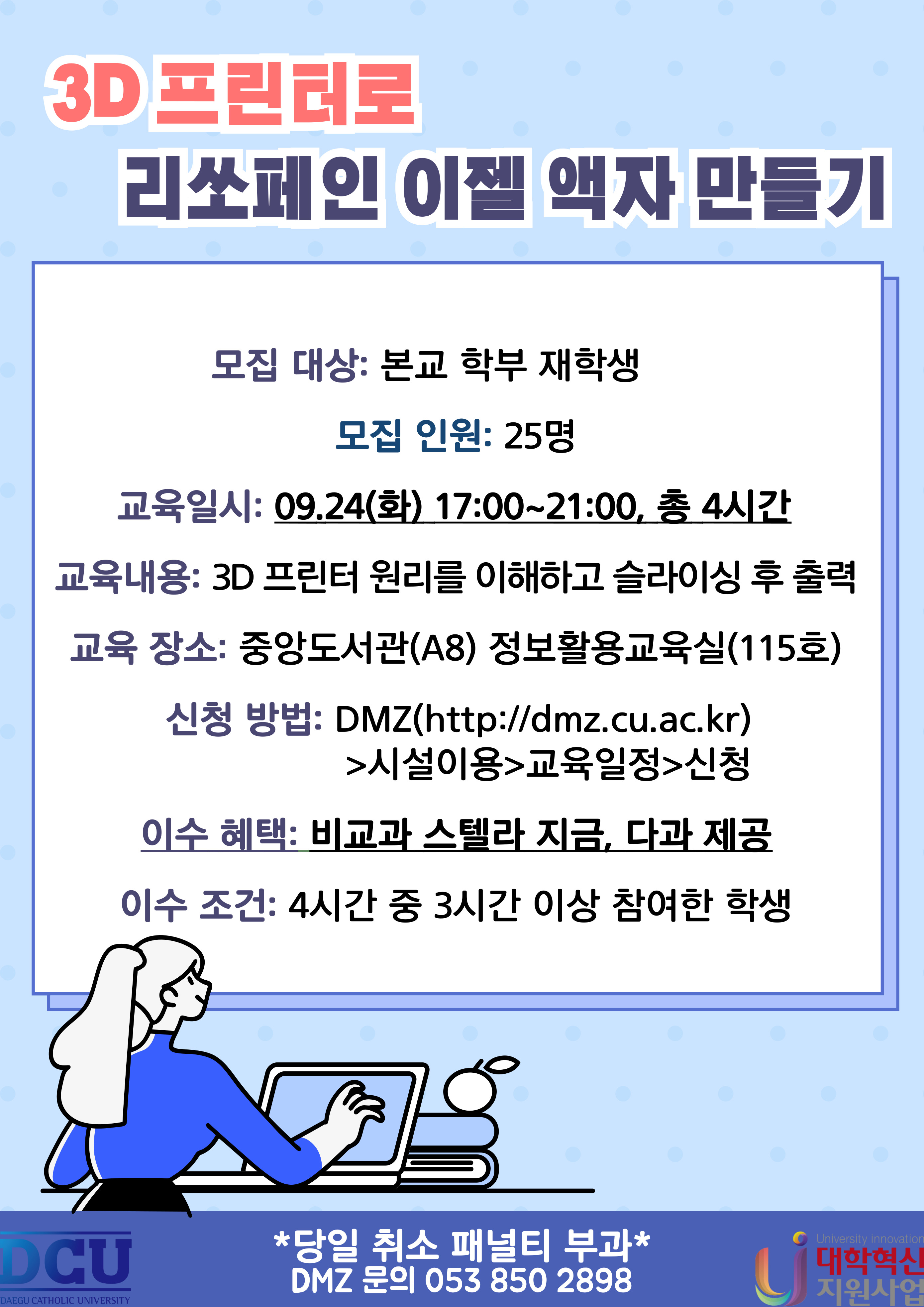 ※ 메이커스페이스 교육 신청 바로가기- 3D 프린터로 리쏘페인 이젤 액자 만들기 교육 프로그램 신청 바로가기: https://dmz.cu.ac.kr/program/edu/plan/view?id=678