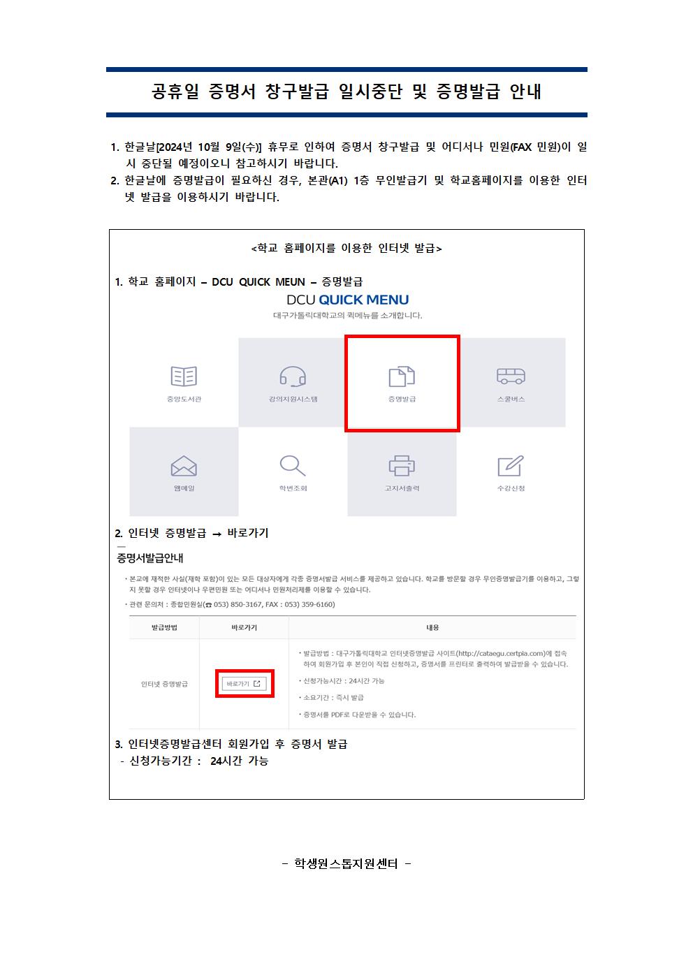 한글날(10월 9일) 증명서 창구발급 일시중단 및 증명발급 안내