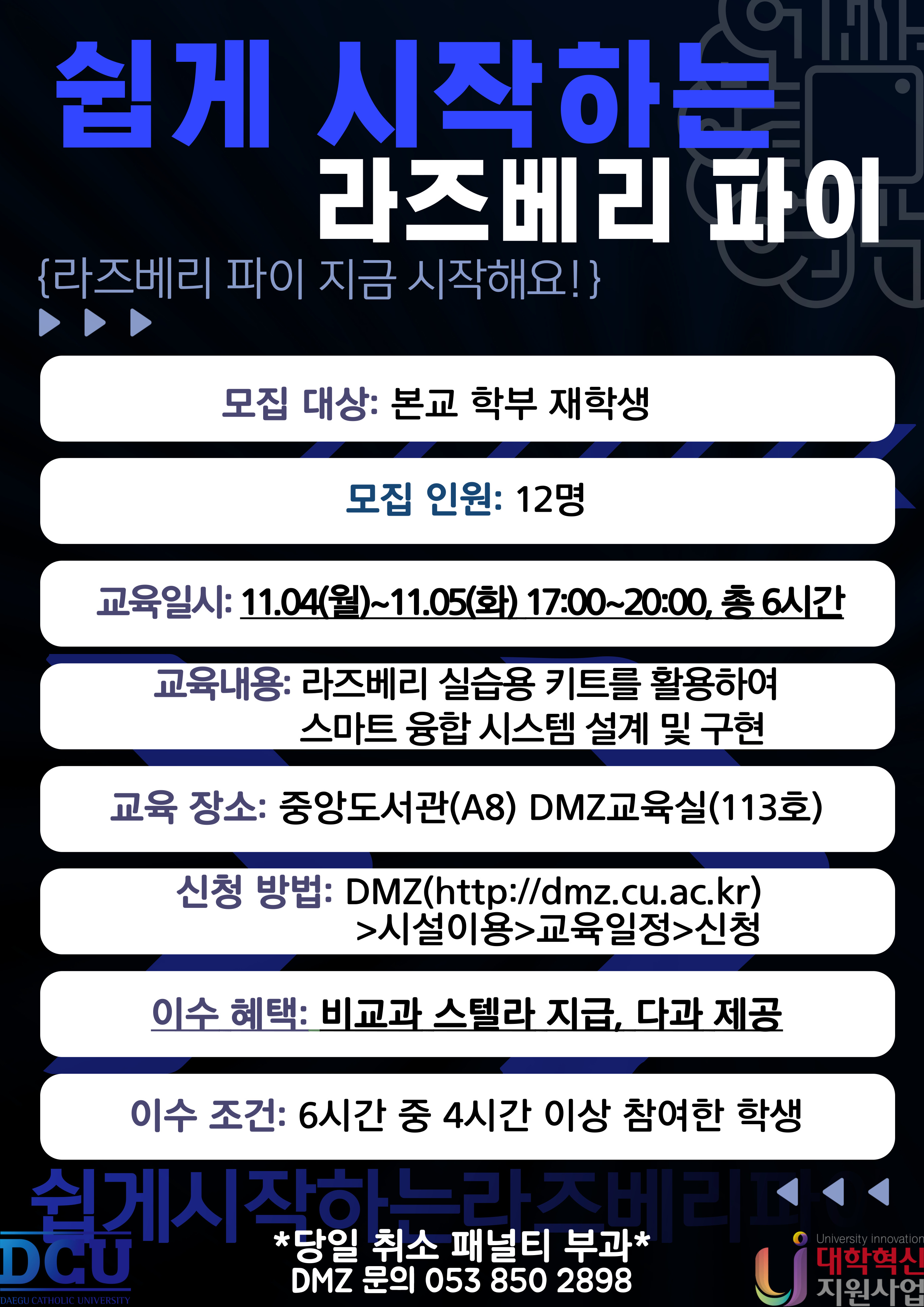 - 쉽게 시작하는 라즈베리 파이 교육 프로그램 신청 바로가기: https://dmz.cu.ac.kr/program/edu/plan/view?id=691