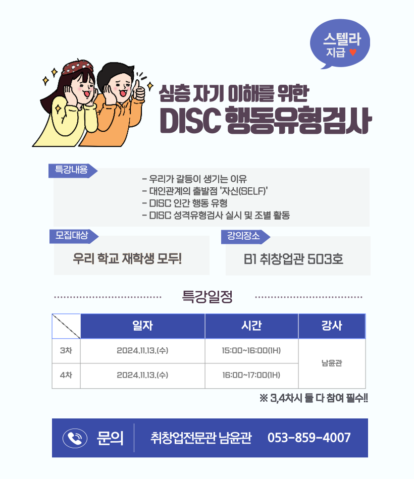 - 3차시 : 2024.11.13.(수) 15:00~16:00 [DISC 이론 설명 및 검사 실시]