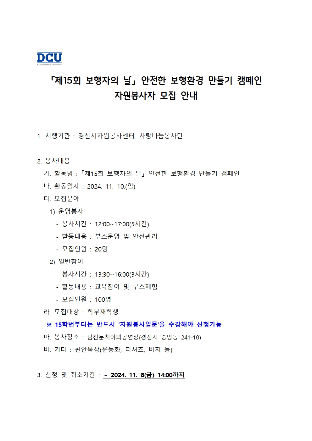 「제15회 보행자의 날」 안전한 보행환경 만들기 캠페인 자원봉사자 모집 안내
