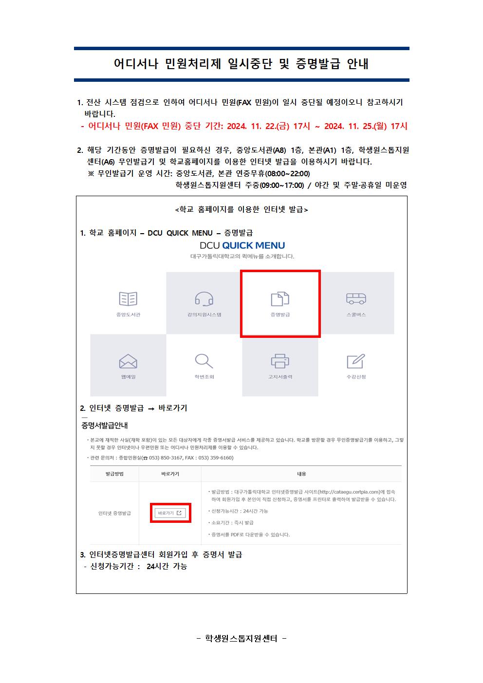 교내 전산시스템 점검으로 인한 어디서나 민원처리제(FAX민원) 일시 중단 안내
