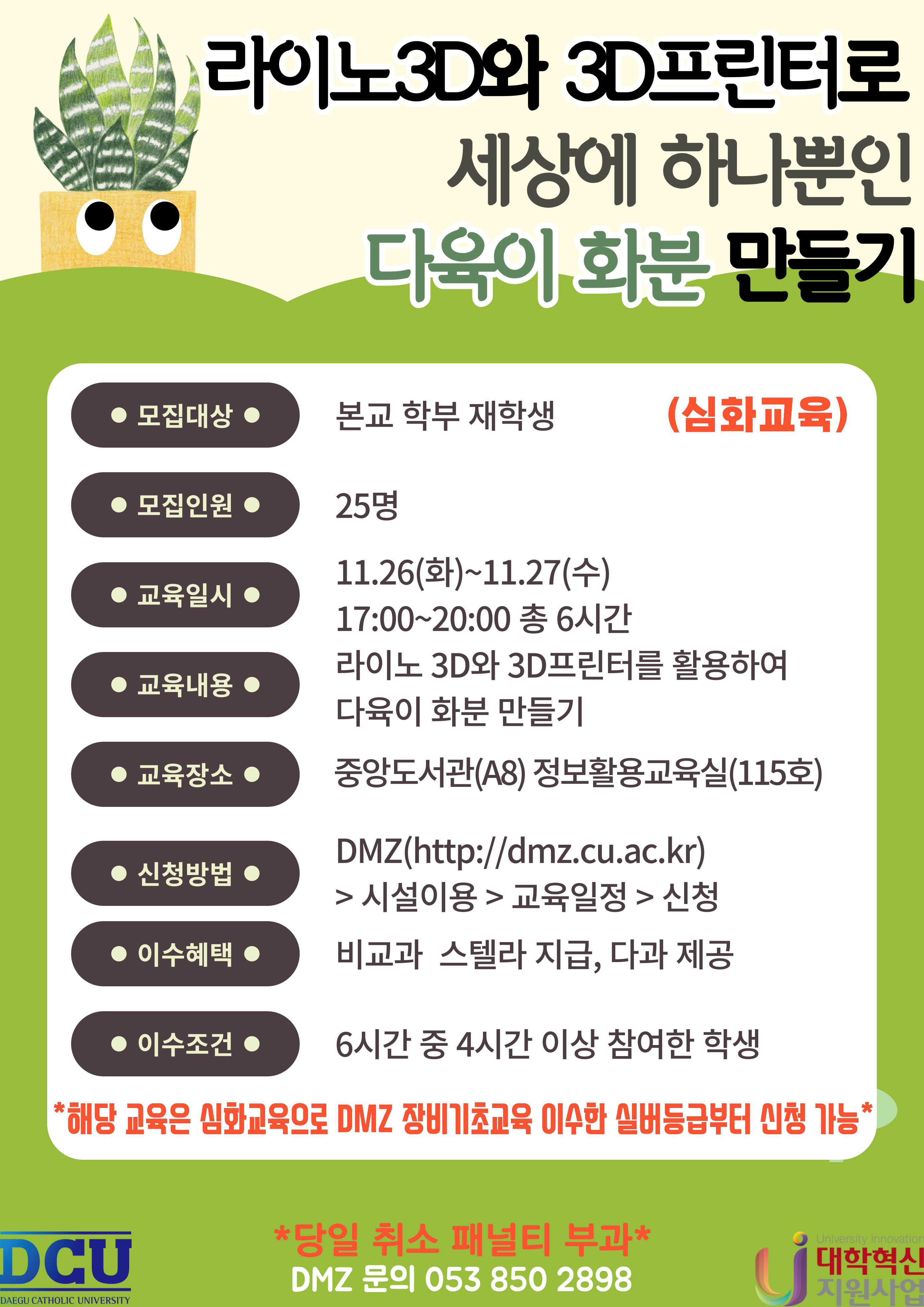- 라이노 3D와 3D 프린터로 세상에 하나뿐인 다육이 화분 만들기 교육 프로그램 신청 바로가기: https://dmz.cu.ac.kr/program/edu/plan/view?id=693
