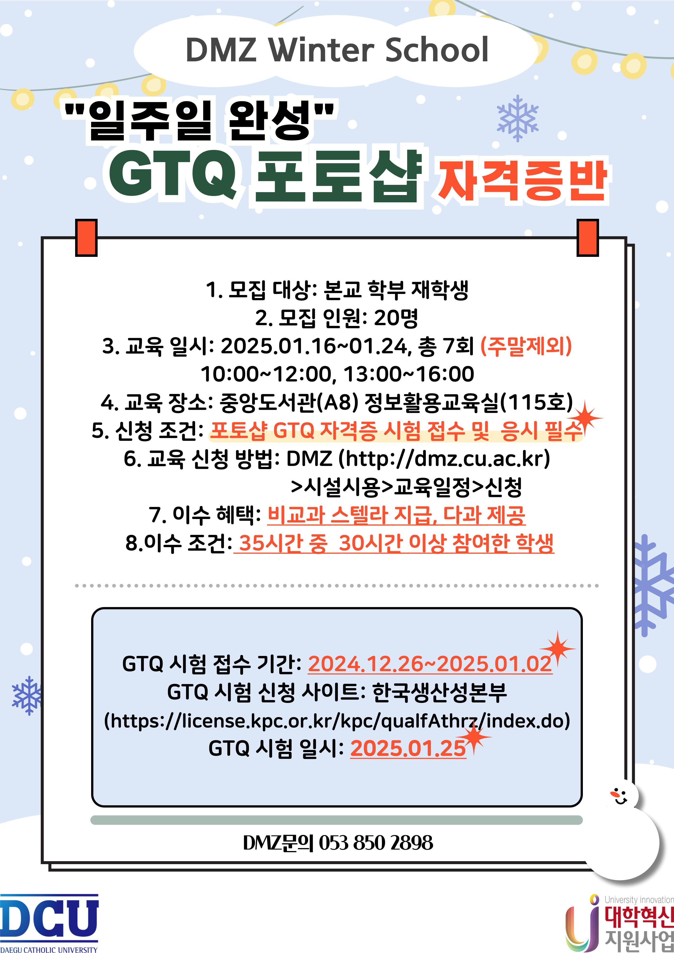 ※ 일주일 완성 GTQ 포토샵 자격증반 프로그램 신청 링크https://dmz.cu.ac.kr/program/edu/plan/view?id=721