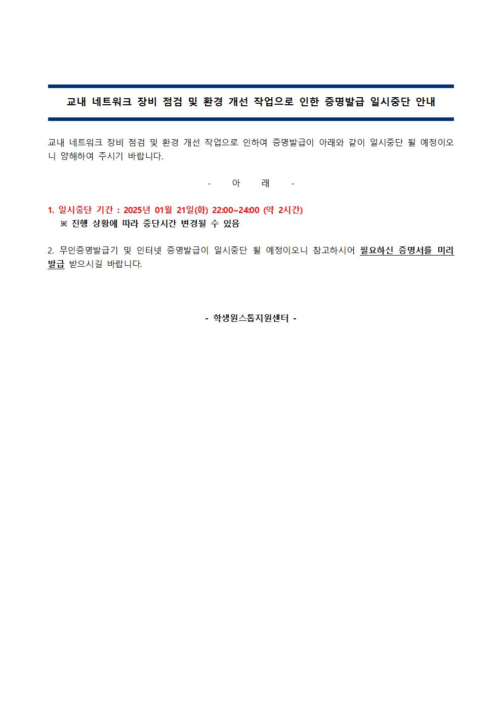 교내 네트워크 장비 점검 및 환경 개선 작업으로 인한 증명발급 일시중단 안내.jpg