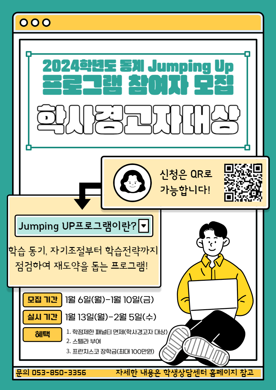 2024학년도 동계 학사경고대상자 대상 'Jumping Up 프로그램' 참여자를 모집합니다.