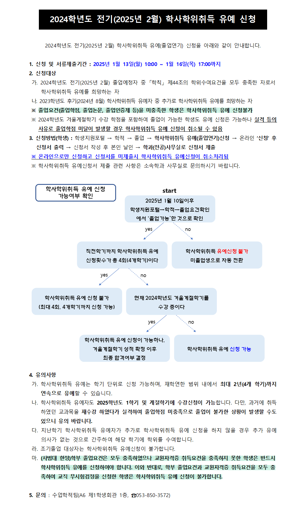 2024학년도 전기(2025년 2월) 학사학위취득 유예 신청