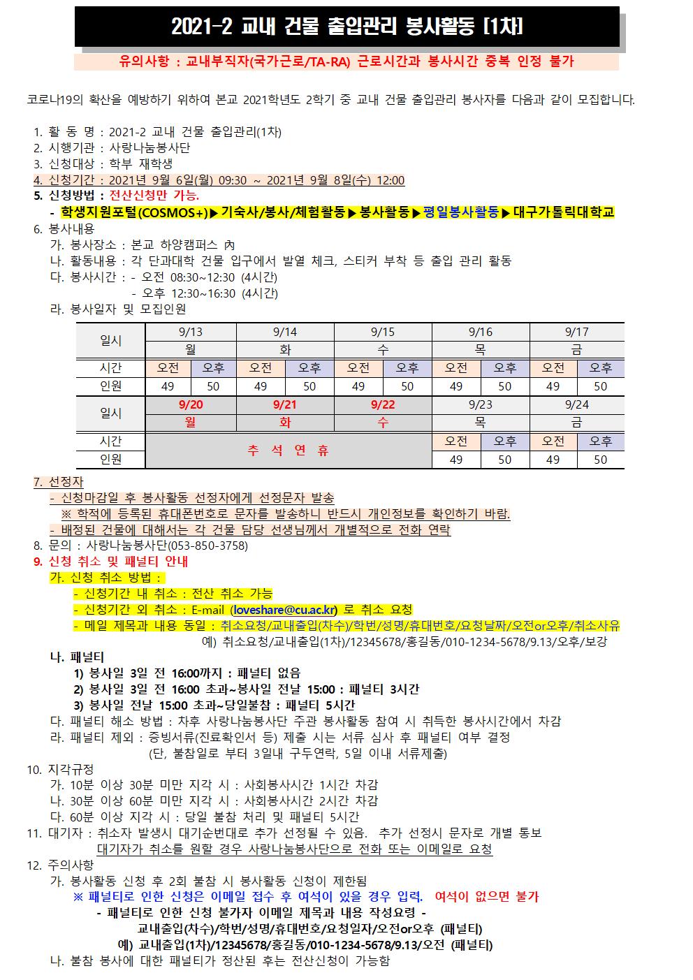 [봉사공지] 2021-2 교내 건물 출입관리 봉사활동 [1차] 모집 안내