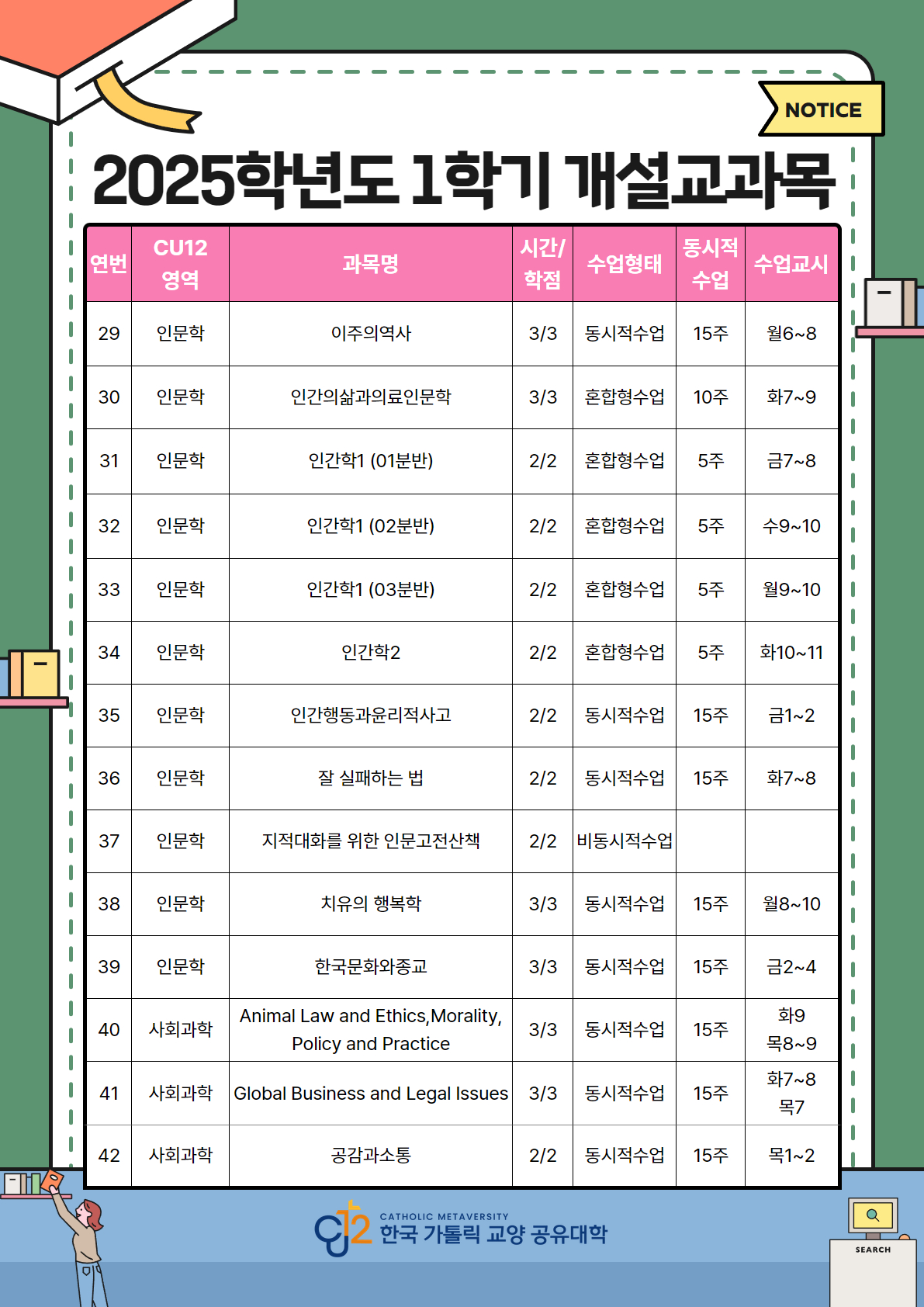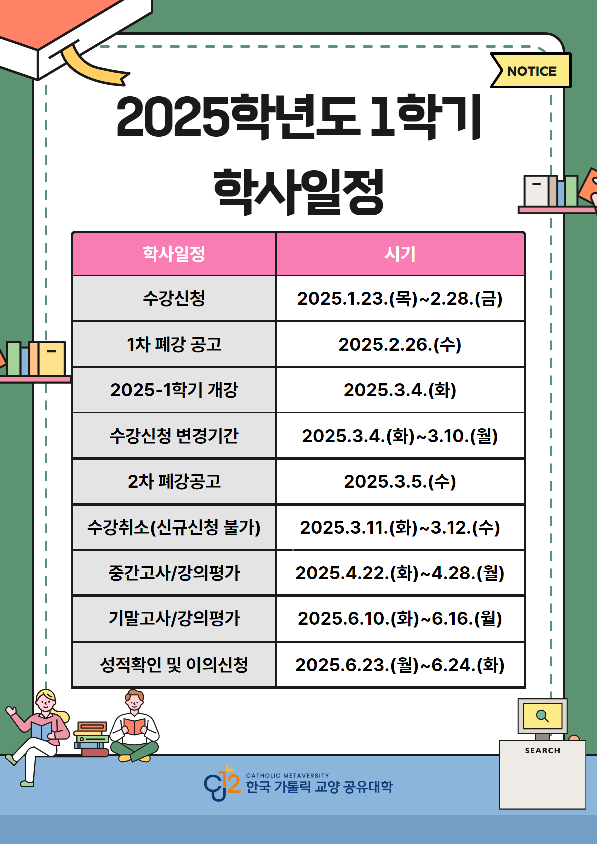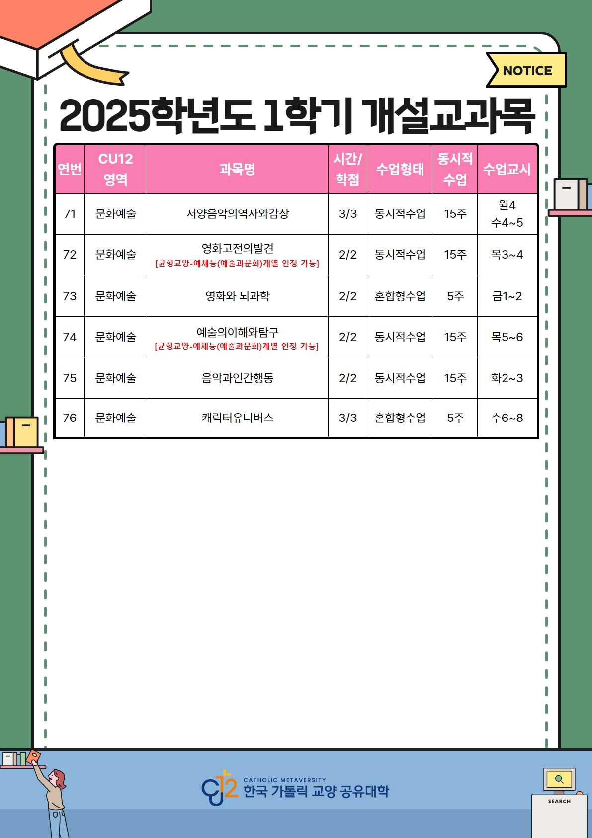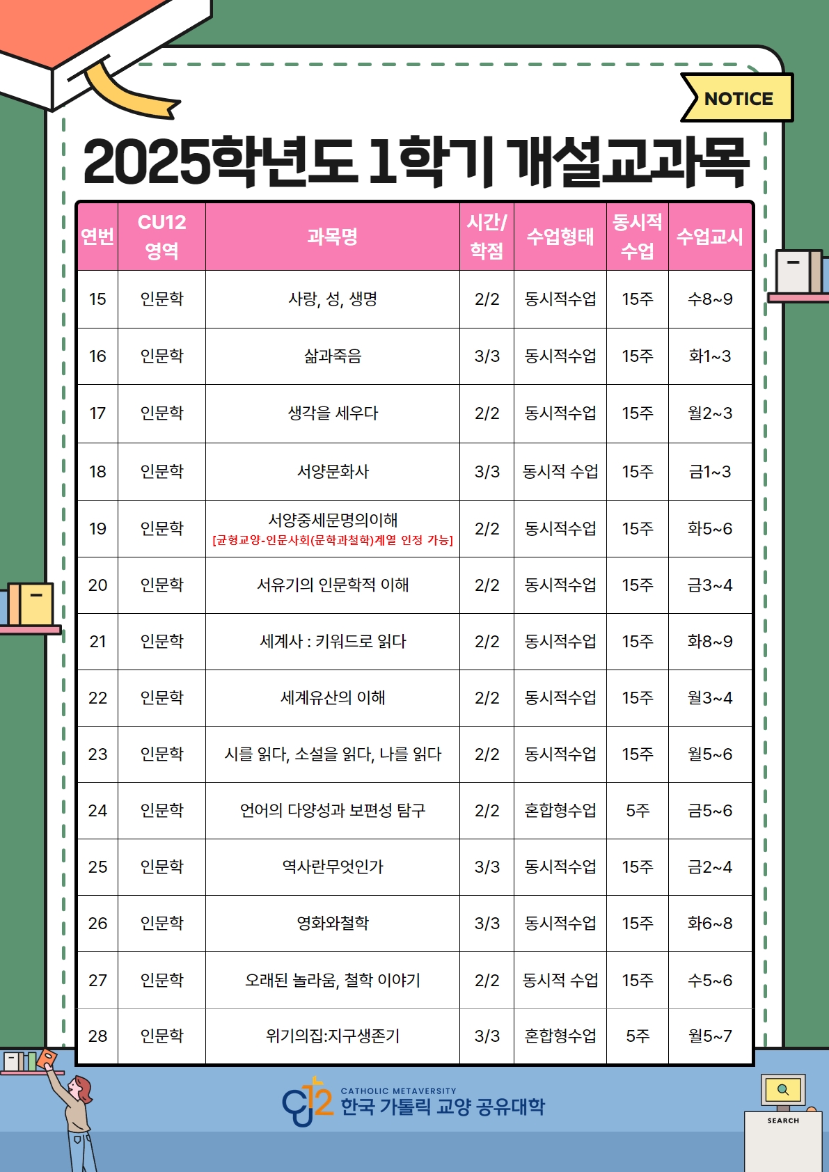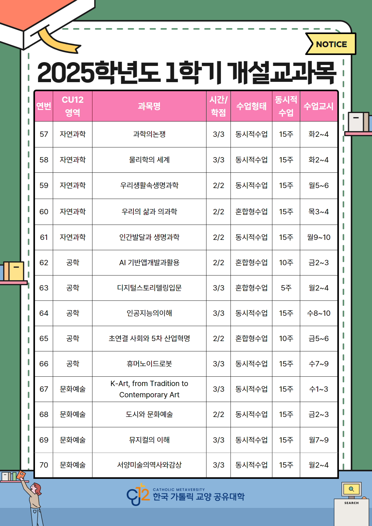 2025학년도 1학기 한국가톨릭교양공유대학(CU12) 수강신청 안내입니다.
