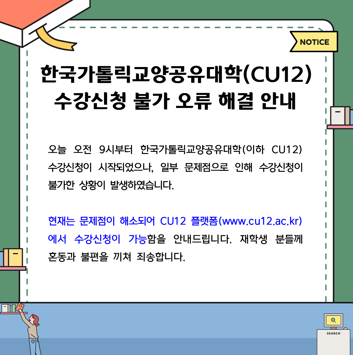 한국가톨릭교양공유대학(CU12) 수강신청 불가 오류 해결 안내입니다.