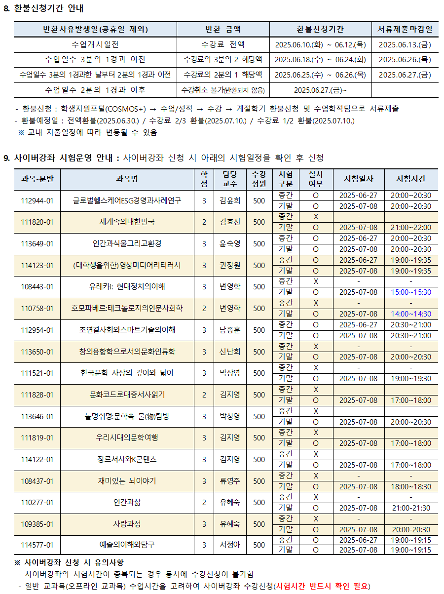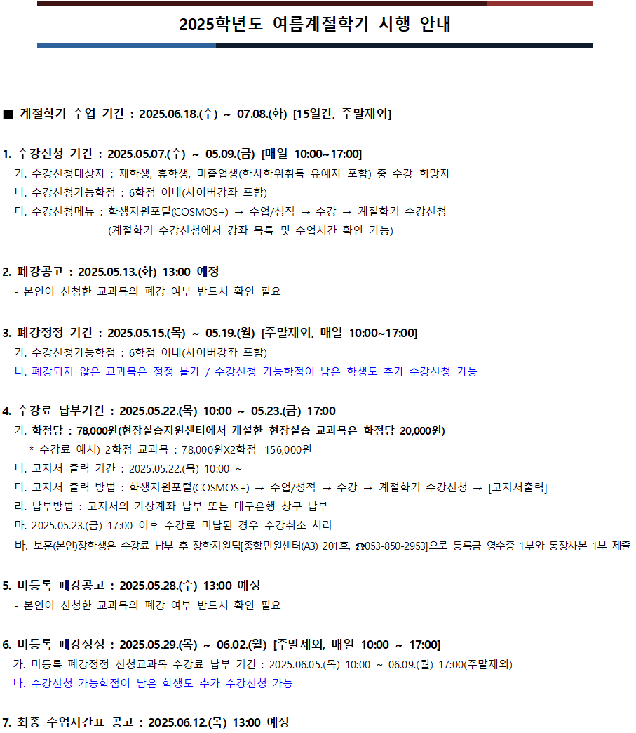 2025학년도 여름계절학기 시행 안내입니다.