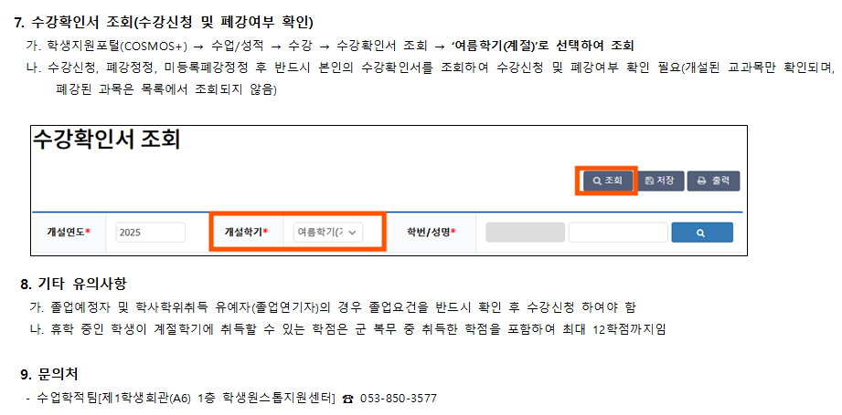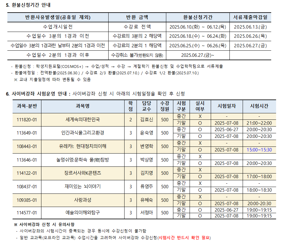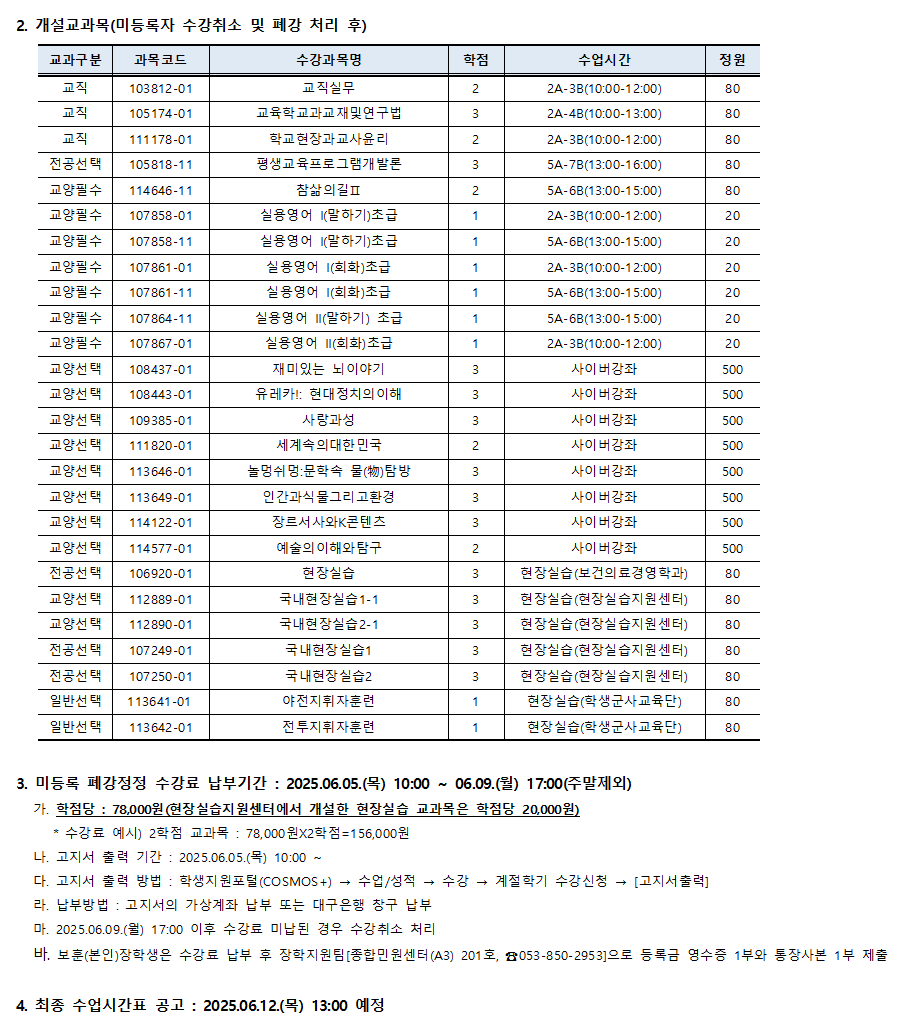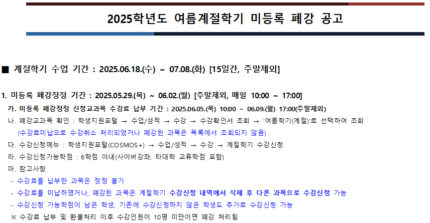 2025학년도 여름계절학기 미등록 폐강 공고입니다.