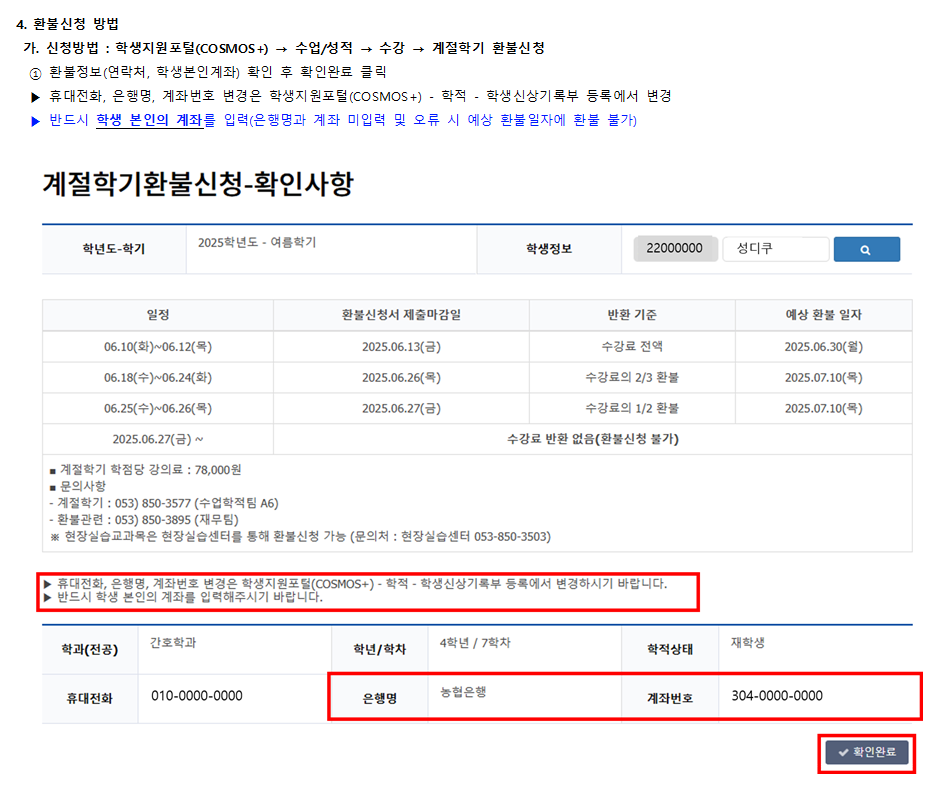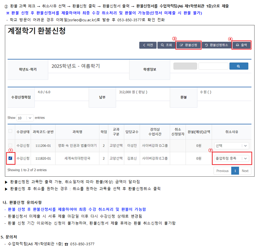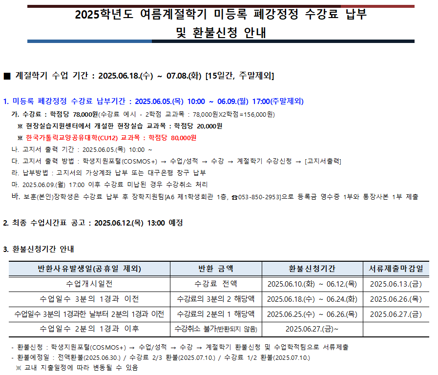 2025학년도 여름계절학기 미등록 폐강정정 수강료 납부 및 환불신청 안내입니다.