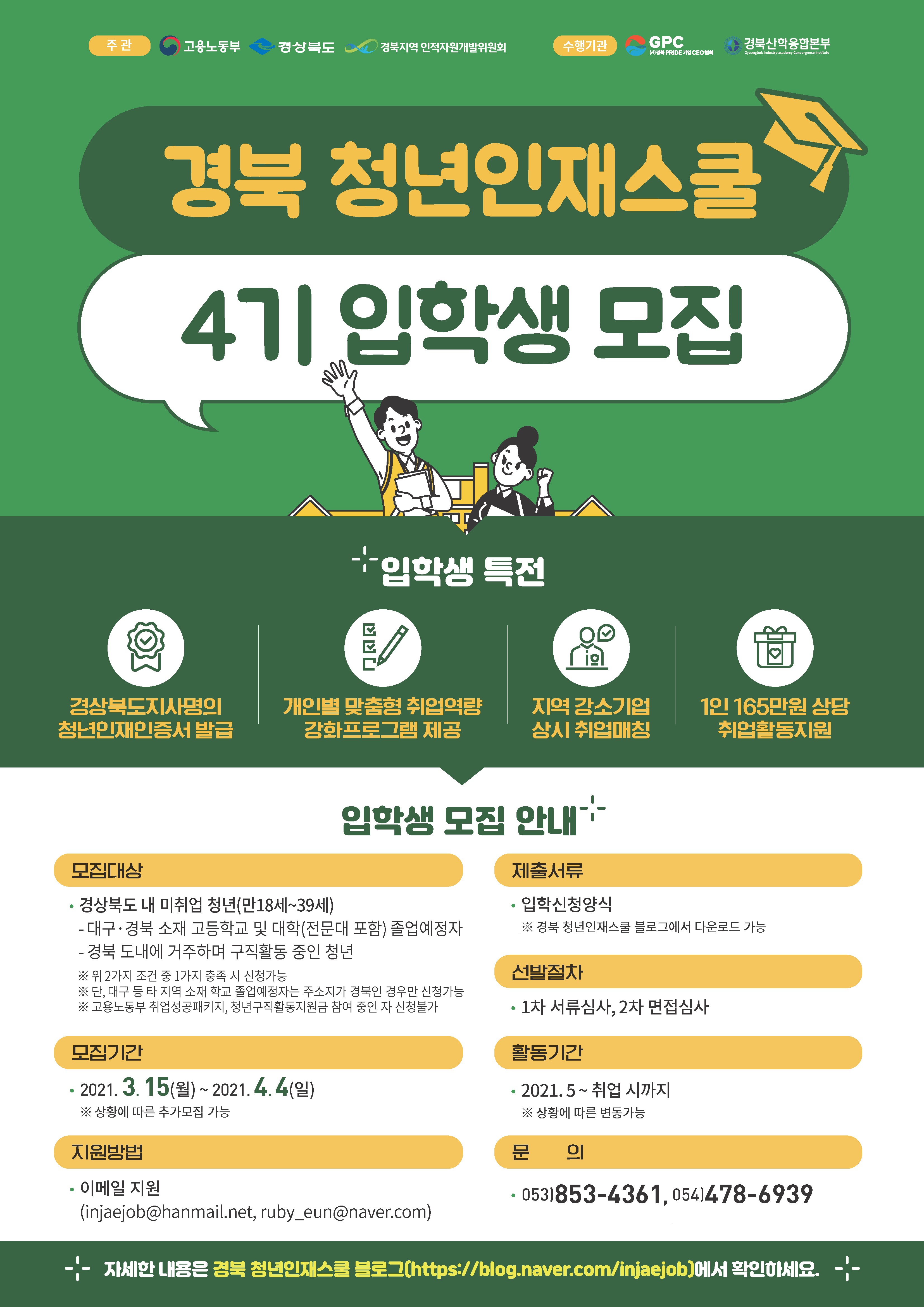(사)경북PRIDE기업 CEO협회와 (사)경북산학융합본부는 고용노동부, 경상북도와 함께 노력과 열정을 가진 지역 청년들을 선발하여 취업역량강화 프로그램 운영과 다양한 취업 활동을 지원하는 경북 청년인재스쿨 4기 사업의 참가자를 아래와 같이 모집하고 있습니다.