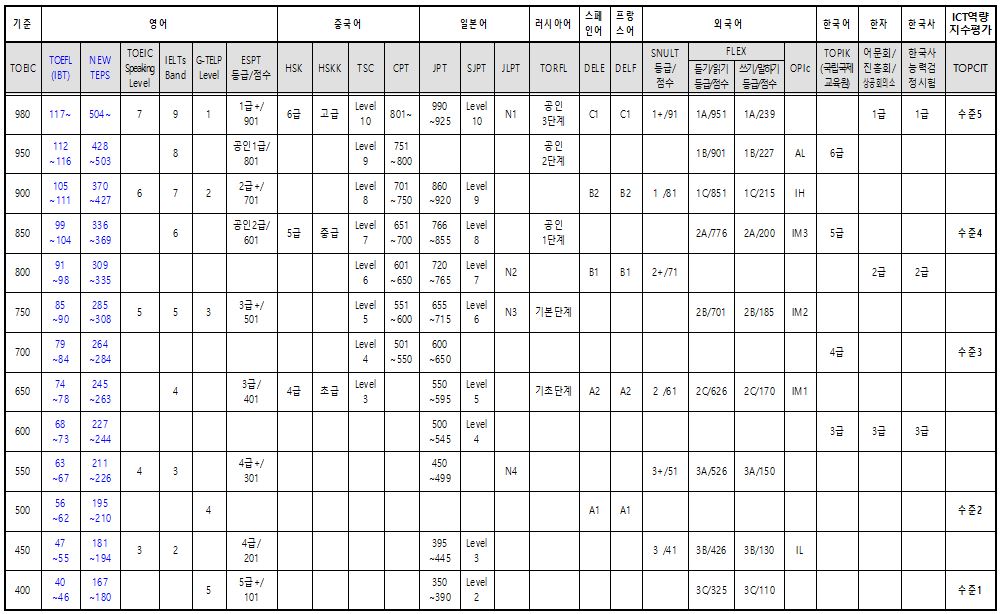 ■ 공인외국어시험 및 기타 자격시험 종류 및 성적 비교표 <첨부파일 참고>