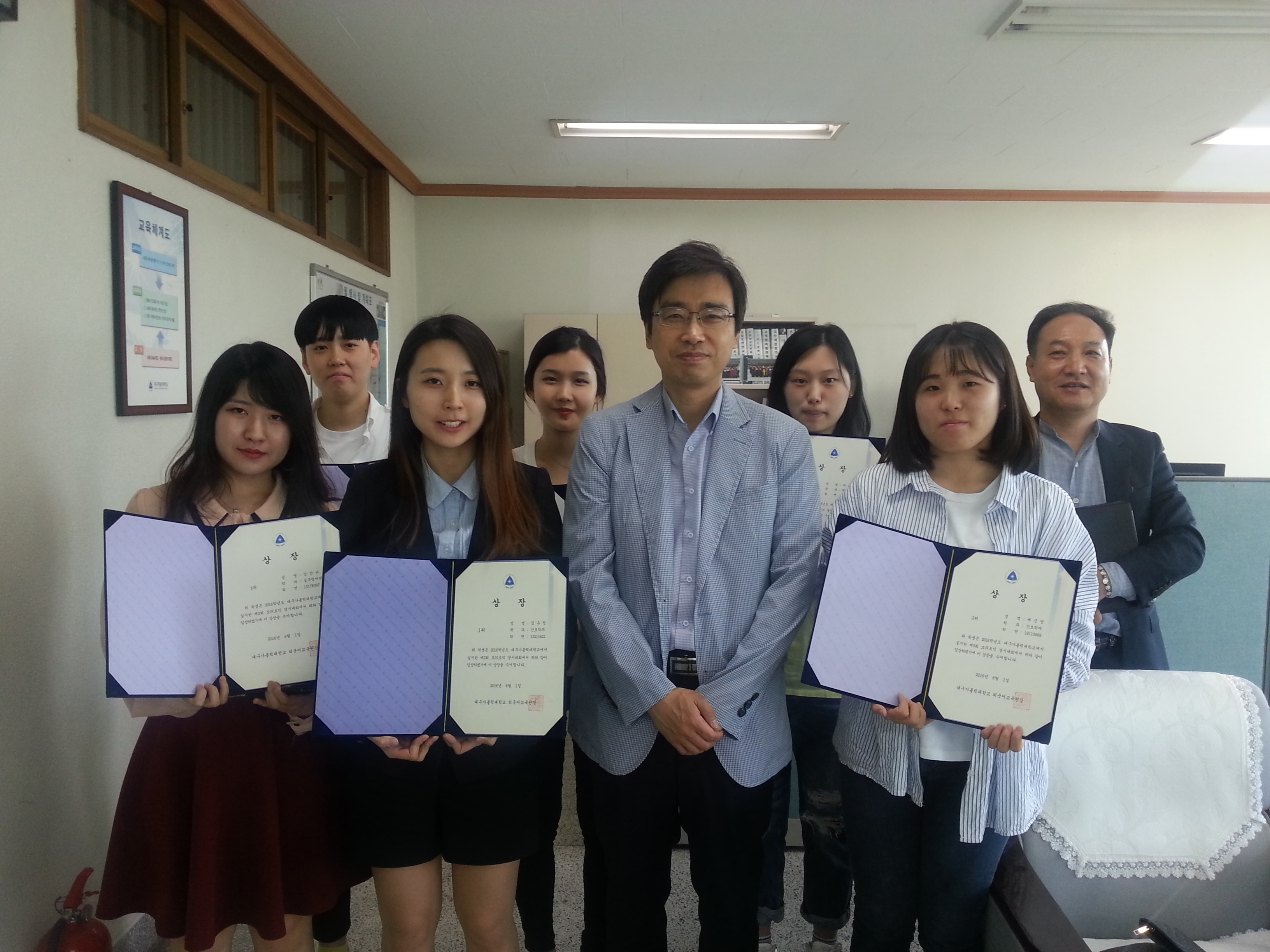 2016년 5월 18일(수)에 열렸던 제3회 모의토익 경시대회 결과에 따른 시상식이 6월 1일(수) 오후 5시 교무처장실에서 열렸습니다. 간호학과 김유정 학생을 포함한 6명의 학생들에게 총 상금 100만원과 상장이 수여되었습니다.