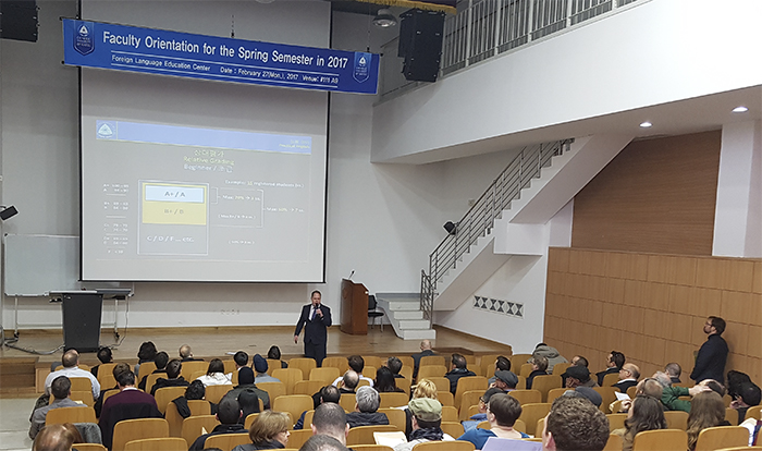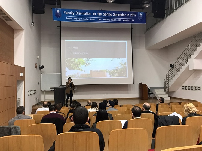 외국어교육원에서는 2월 27일 종합강의동 111호에서 외국어교육원 소속 외국인 전임교원 오리엔테이션을 실시했습니다. 2017학년도 1학기 신규 외국인 전임교원 16명을 포함한 총 63명의 외국어교육원 소속 외국인 전임교원을 대상으로 학사 행정 업무 전반에 관한 안내를 진행했습니다. 해당 외국인 전임교원들은 교양필수 실용영어를 포함한 외국어교육원 개설 교과목을 담당하고 있습니다.
