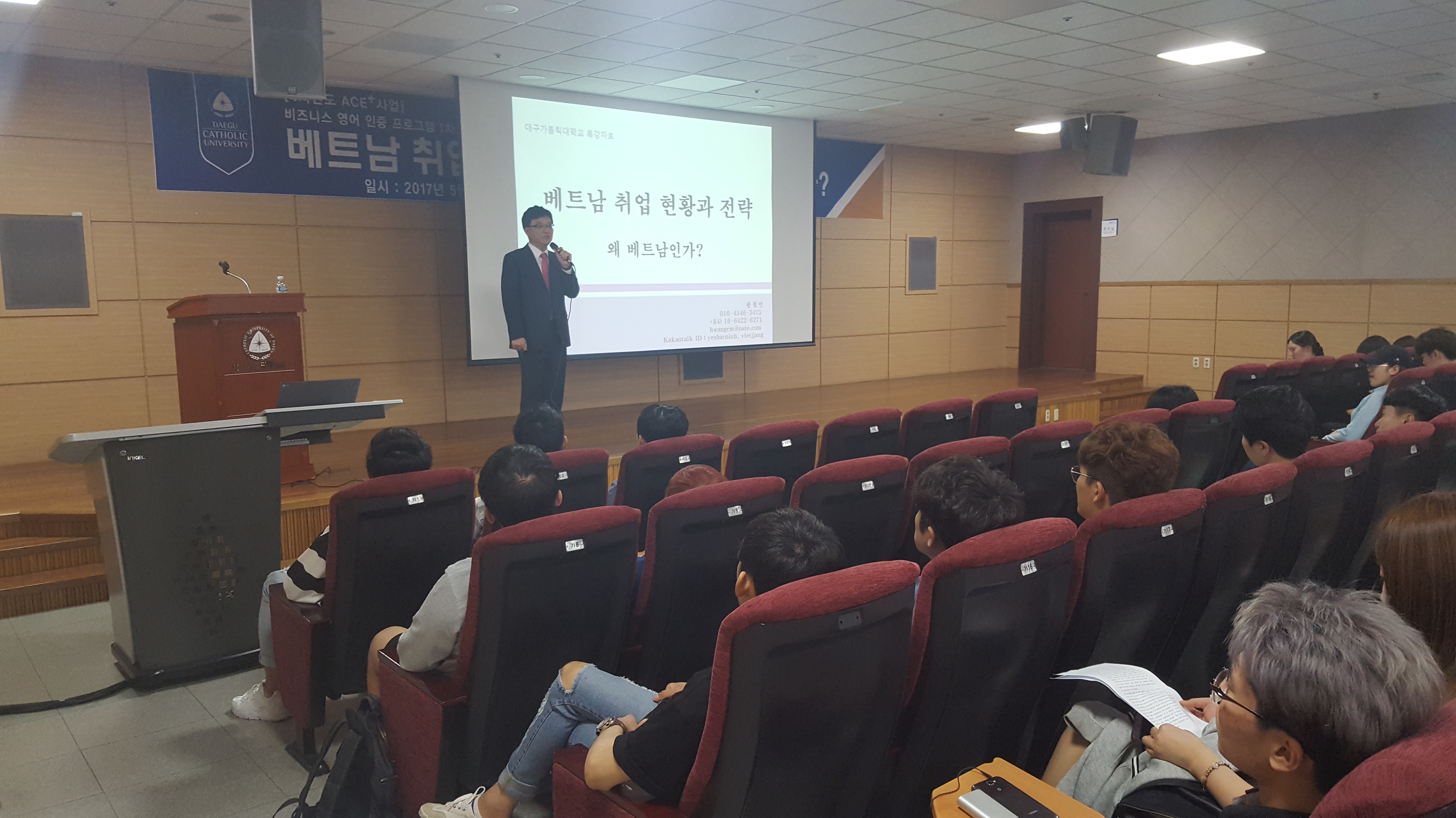 2017학년도 1학기 비교과 활동 중 하나로 진행된 릴레이 특강 5회차 중 1회차는 '베트남 취업 현황과 전략, 왜 베트남인가?'라는 주제로 황철민 V SPIRIT 대표의 특강으로 진행됐습니다.