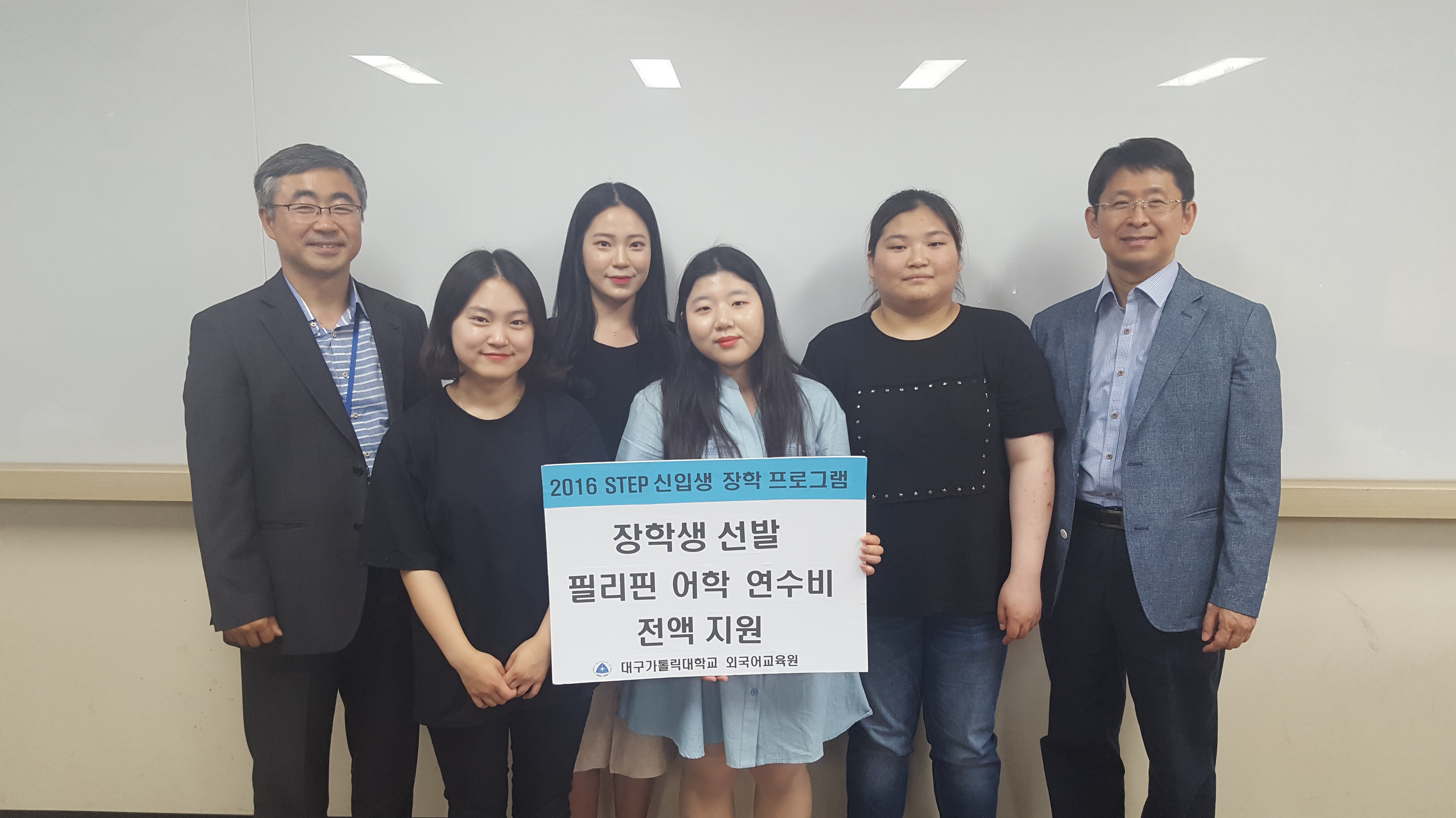 외국어교육원에서는 5월 25일 국제처장실에서 필리핀 어학연수 장학생 선발식을 가졌습니다. 2016학년도 신입생 특별과정 수강생 중 4명의 장학생을 선발해 오는 여름방학 필리핀 어학연수 기회를 제공하고, 장학생으로 선발된 학생에게는 4주 간의 연수비, 숙식비, 주말 활동 체험비 전액이 지원됩니다.