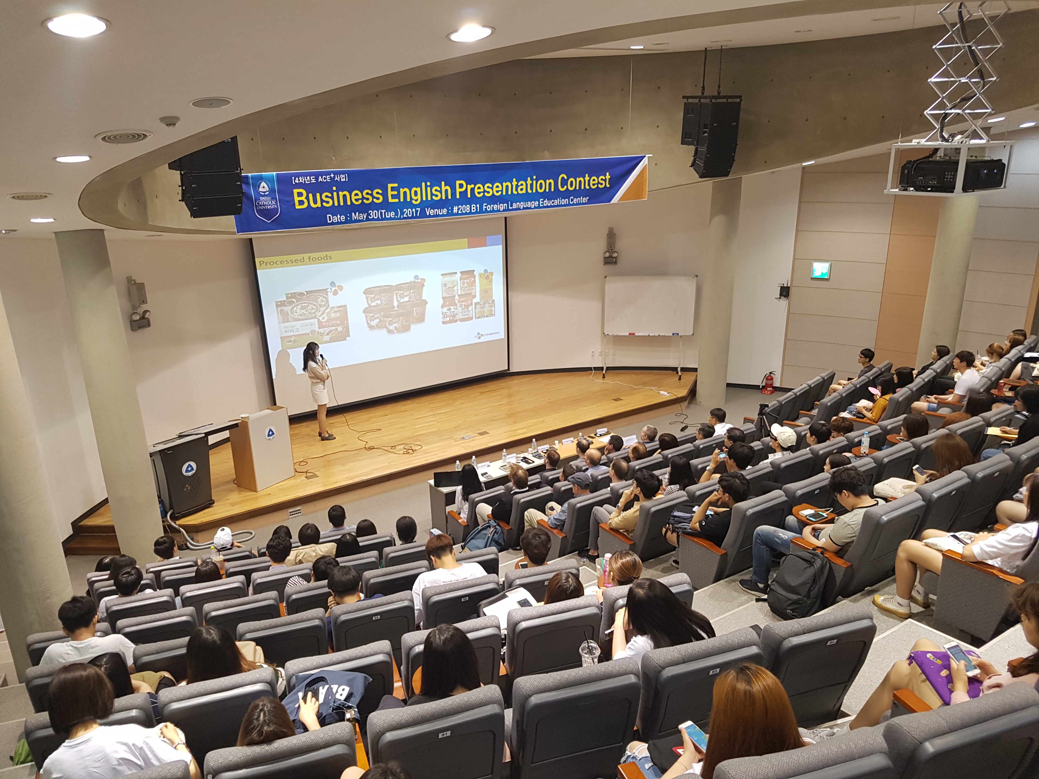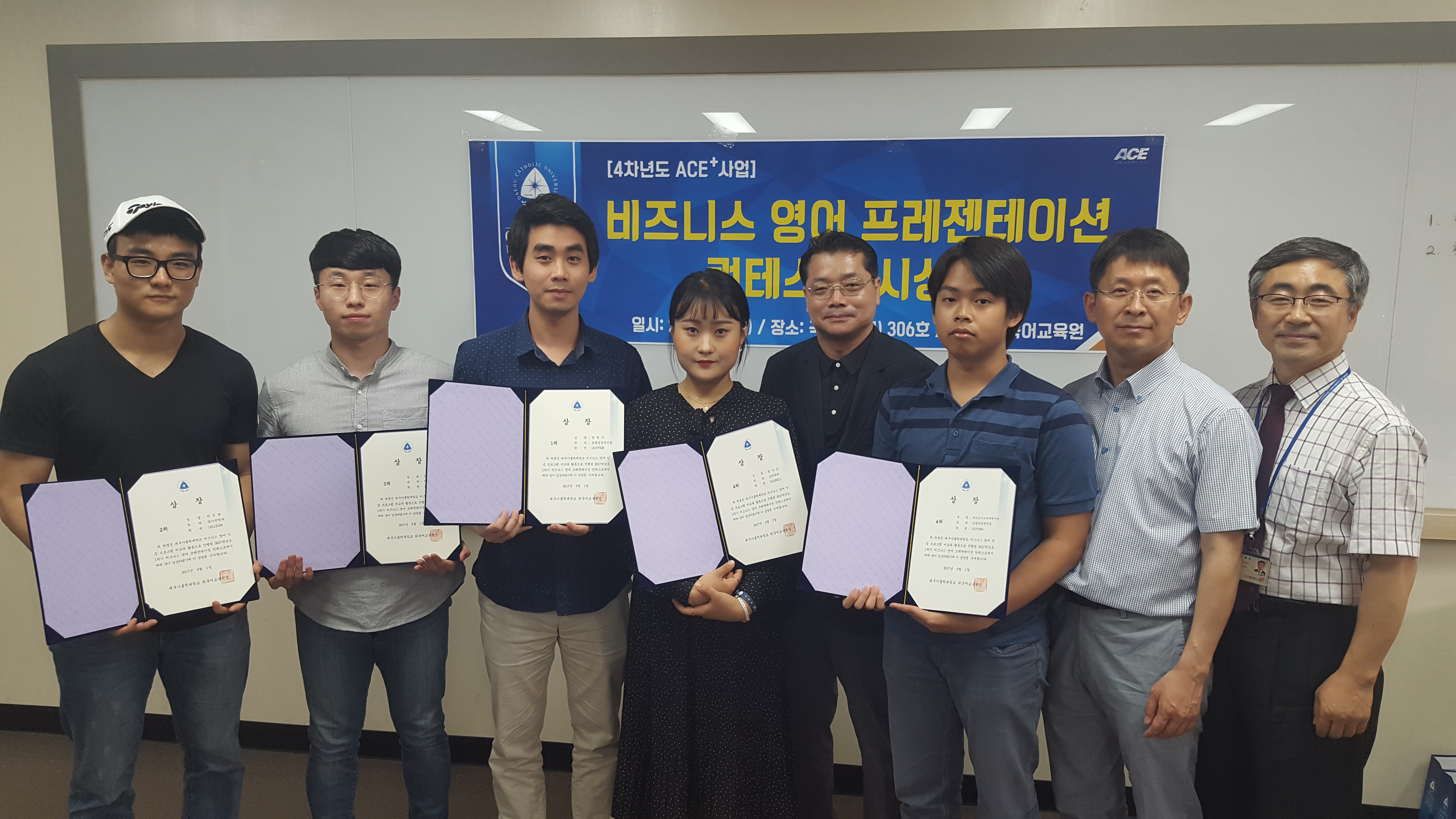 외국어교육원에서는 지난 5월 30일(화) 오전 11시 취창업관 208호에서 비즈니스 영어 프레젠테이션 컨테스트를 개최했습니다. 2017학년도 1학기 비즈니스 영어 인증 프로그램 관련 교과목을 수강하는 학생 780여 명 중 1차 및 2차 심사를 통과한 15명의 학생들이 컨테스트에 참여했습니다. 수상자 6명에게는 6월 1일(목) 국제처장실에서 1등 50만원 포함, 상금 총 140만원과 상장이 지급되었습니다.