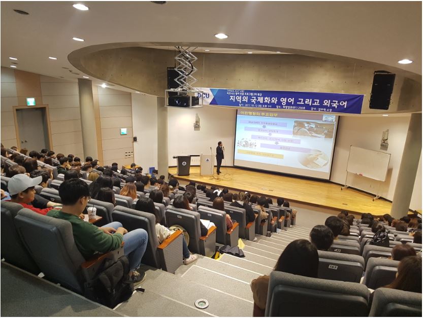 특강을 맡은 김두락 대구출입국관리사무소장은 '지역의 국제화와 영어 그리고 외국어'라는 주제로 학생들에게 취업을 위한 영어의 중요성에 대해 강의했습니다.