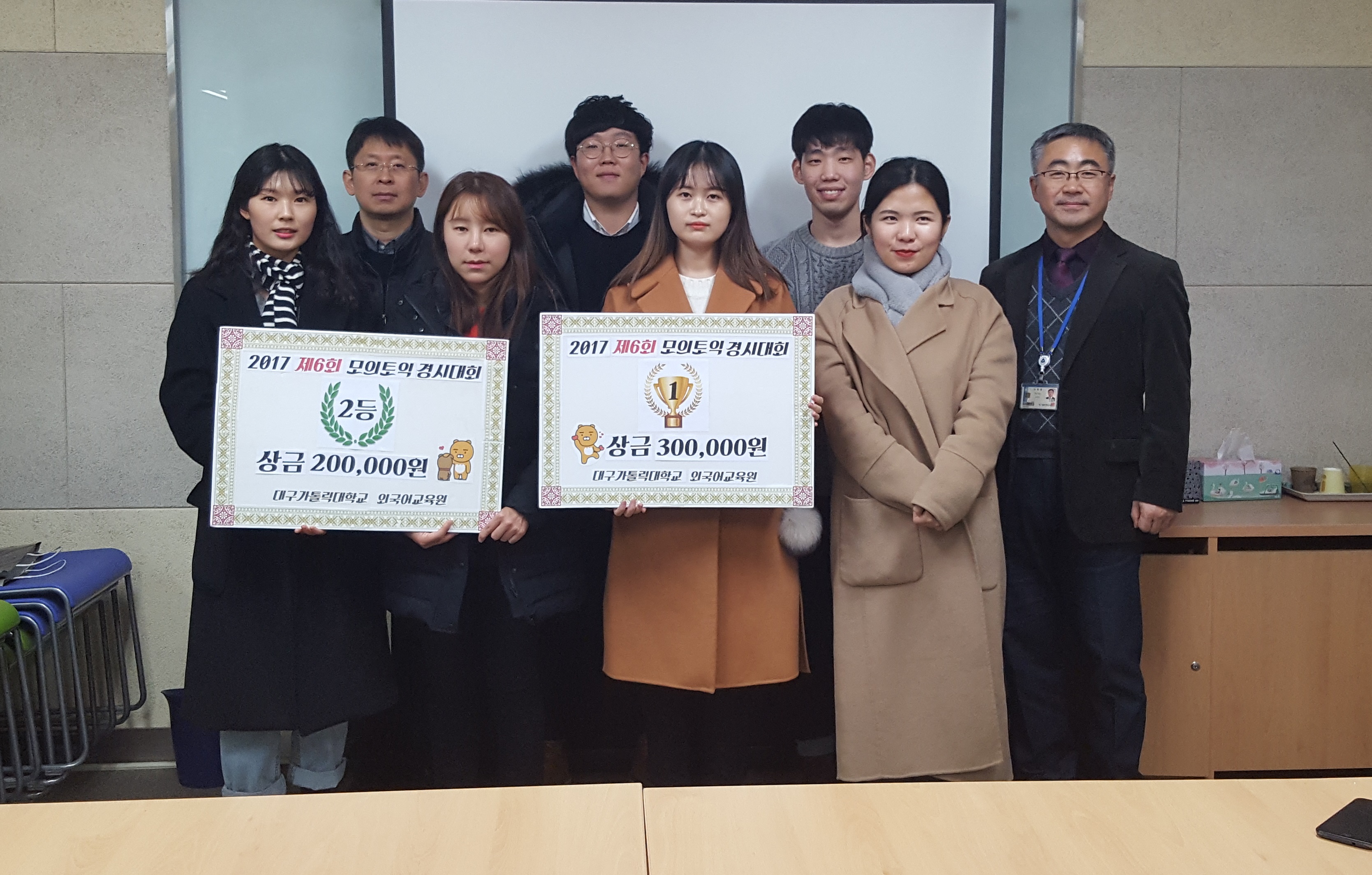 외국어교육원은 지난 11월 23일(목) 열렸던 제 6회 모의토익 경시대회 수상자들에 대한 시상식을 12월 6일(수) 진행했습니다. 1등 조효민 학생을 포함, 총 6명의 학생들에게 총 상금 100만원이 지급되었습니다.