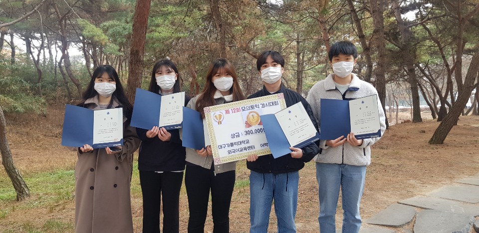 외국어교육센터에서는 재학생들의 토익 실력 향상을 위해 매 학기 모의토익 경시대회를 진행하고 있습니다. 코로나19로 인해 취소되었던 2020학년도 1학기 모의토익 경시대회는 11월 26일(목) 교양관(A2)에서 진행되었고, 80여 명의 학생들이 참여해 그 중 6명을 선발해 12월 7일(월) 시상식을 했습니다. 수상자들은 1등 30만원을 포함해 총 100만원의 상금과 상장을 받았습니다.