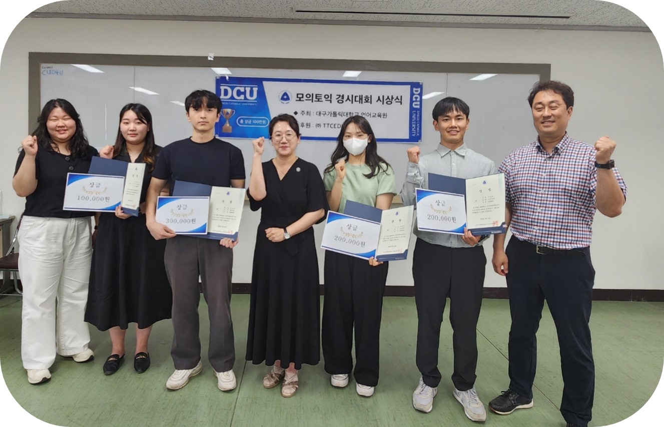 이번 모의토익 경시대회는 본교 교양관에서 총 52명의 학생들이 응시하여 각자의 토익 실력을 겨루었다. 1위 1명, 2위 2명, 3위 3명 총 6명의 학생들이 총 100만 원의 상금을 수상했다.