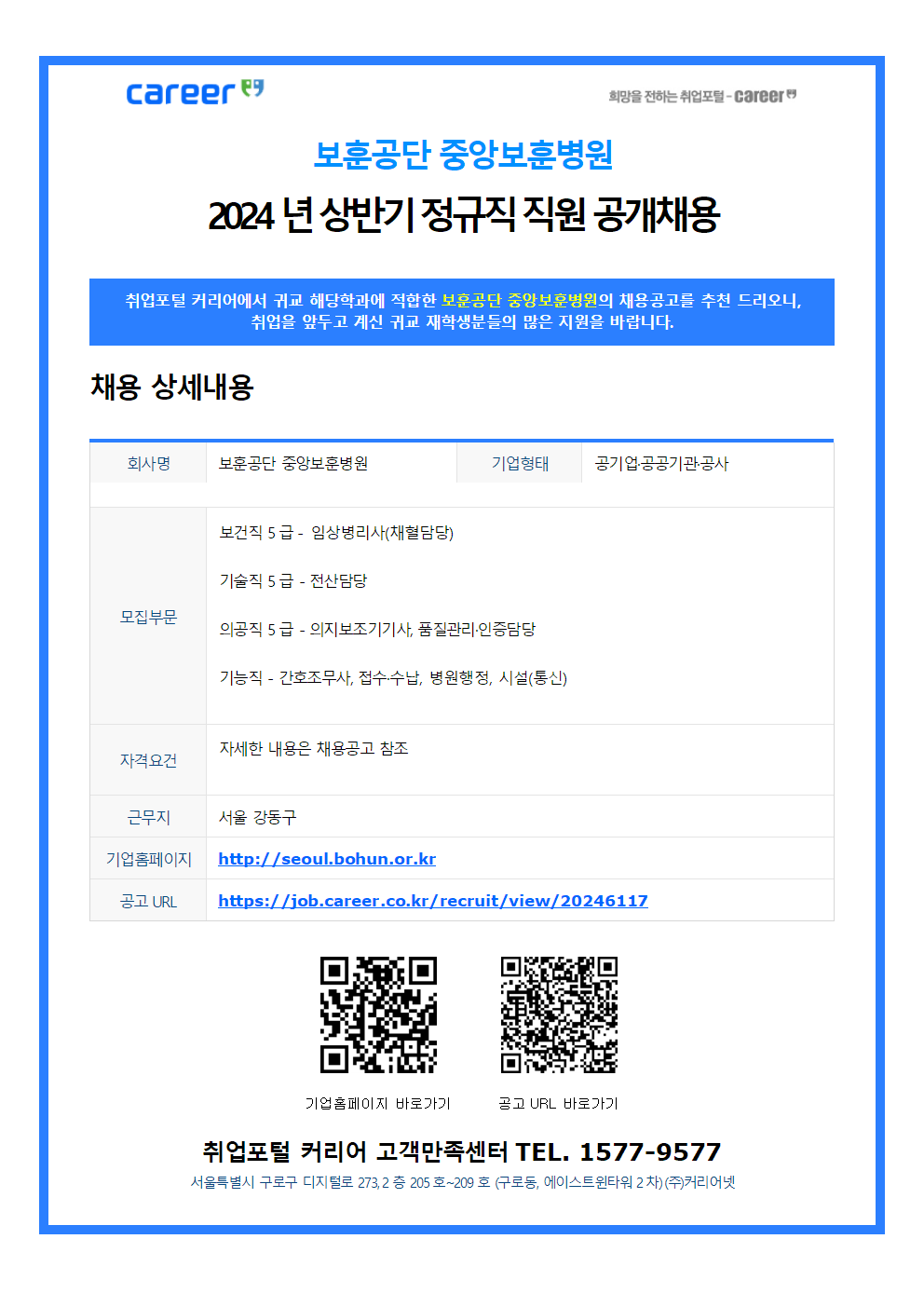 [커리어] 중앙보훈병원 2024년 상반기 정규직 직원 공개채용(~5/7)