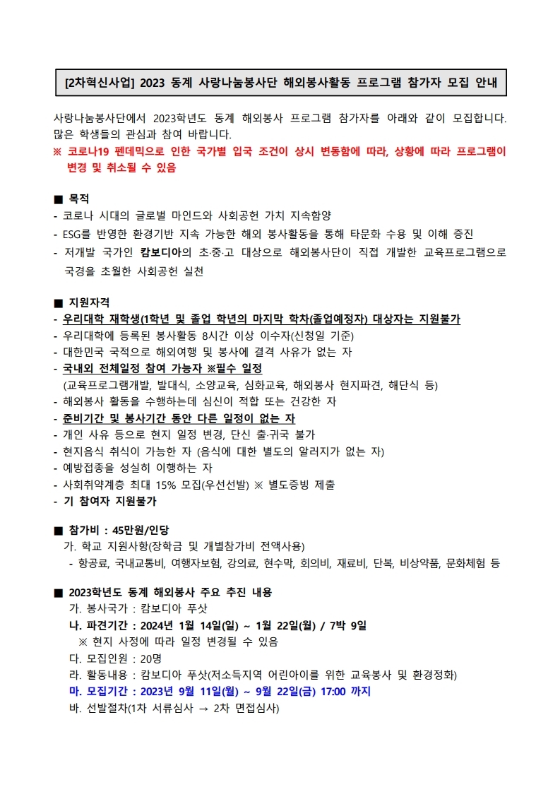 [2차혁신사업] 2023 동계 사랑나눔봉사단 해외봉사활동 프로그램 참가자 모집 안내